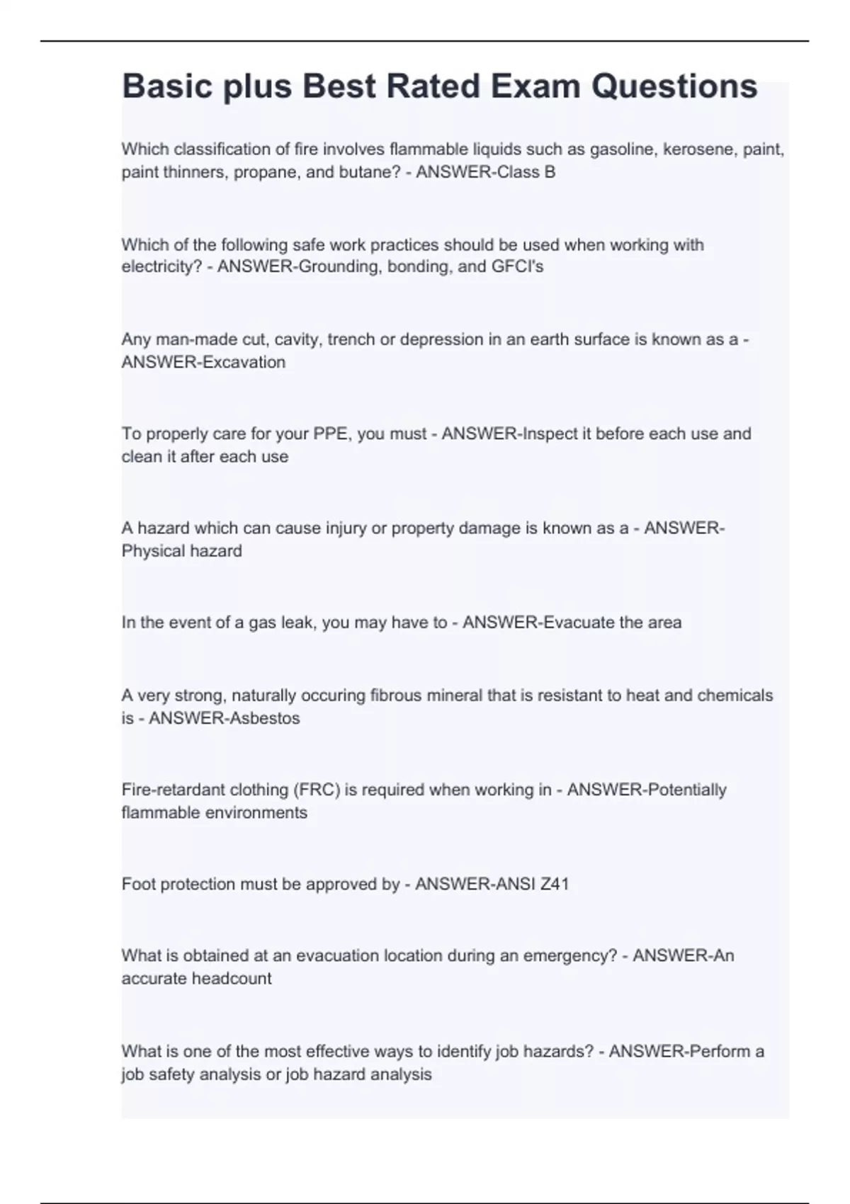 Which classification of fire involves flammable liquids such as gasoline, kerosene, paint, paint thinners, propane, and butane? - ANSWER-Class B Which of the following safe work practices should be used when working with electricity? - ANSWER-Grounding, bonding, and GFCI's Any man-made cut, cavity, trench or depression in an earth surface is known as a - ANSWER-Excavation To properly care for your PPE, you must - ANSWER-Inspect it before each use and clean it after each use A hazard which can cause injury or property damage is known as a - ANSWER-Physical hazard In the event of a gas leak, you may have to - ANSWER-Evacuate the area A very strong, naturally occuring fibrous mineral that is resistant to heat and chemicals is - ANSWER-Asbestos Fire-retardant clothing (FRC) is required when working in - ANSWER-Potentially flammable environments Foot protection must be approved by - ANSWER-ANSI Z41 What is obtained at an evacuation location during an emergency? - ANSWER-An accurate headcount