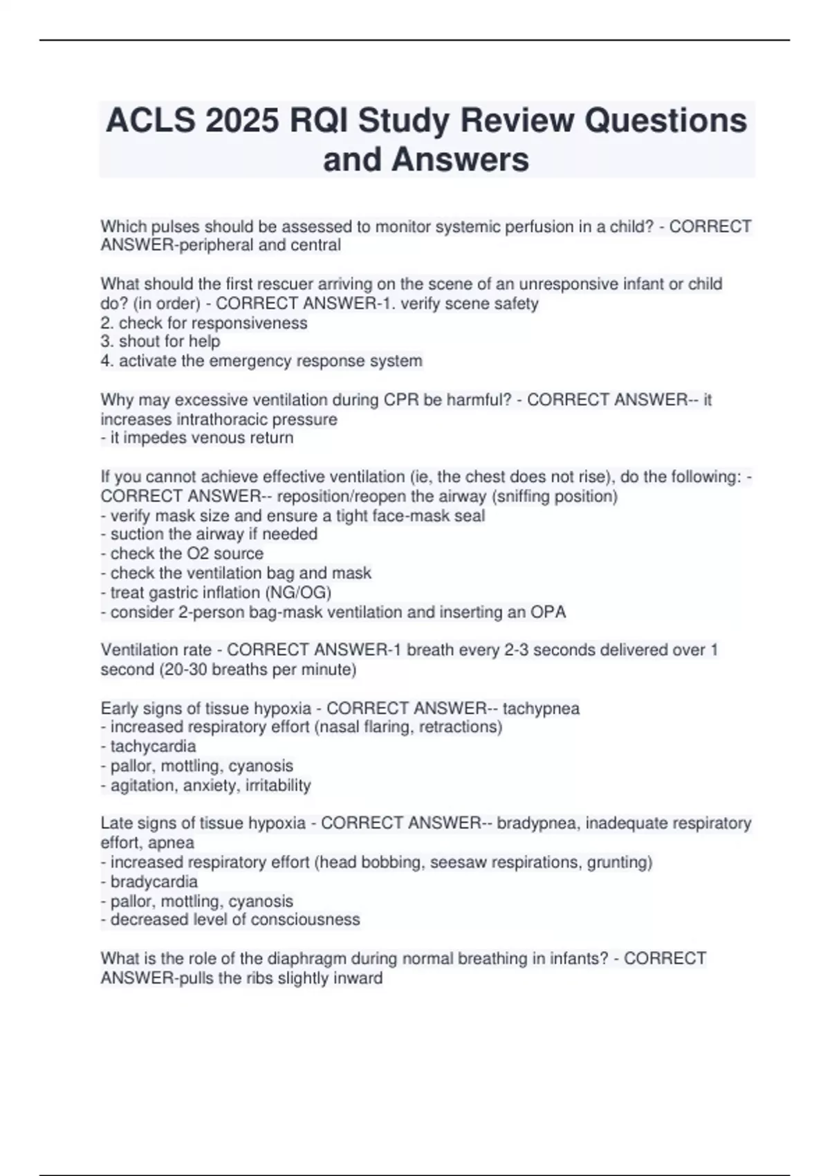 ACLS 2025 RQI Study Review Questions and Answers Which pulses should be assessed to monitor systemic perfusion in a child? - CORRECT ANSWER-peripheral and central What should the first rescuer arriving on the scene of an unresponsive infant or child do? (in order) - CORRECT ANSWER-1. verify scene safety 2. check for responsiveness 3. shout for help 4. activate the emergency response system Why may excessive ventilation during CPR be harmful? - CORRECT ANSWER-- it increases intrathoracic pressure - it impedes venous return If you cannot achieve effective ventilation (ie, the chest does not rise), do the following: - CORRECT ANSWER-- reposition/reopen the airway (sniffing position) - verify mask size and ensure a tight face-mask seal - suction the airway if needed - check the O2 source - check the ventilation bag and mask - treat gastric inflation (NG/OG) - consider 2-person bag-mask ventilation and inserting an OPA Ventilation rate - CORRECT ANSWER-1 breath every 2-3 seconds delivered over 1 second (20-30 breaths per minute) Early signs of tissue hypoxia - CORRECT ANSWER-- tachypnea - increased respiratory effort (nasal flaring, retractions) - tachycardia - pallor, mottling, cyanosis - agitation, anxiety, irritability Late signs of tissue hypoxia - CORRECT ANSWER-- bradypnea, inadequate respiratory effort, apnea - increased respiratory effort (head bobbing, seesaw respirations, grunting) - bradycardia - pallor, mottling, cyanosis - decreased level of consciousness What is the role of the diaphragm during normal breathing in infants? - CORRECT ANSWER-pulls the ribs slightly inwar