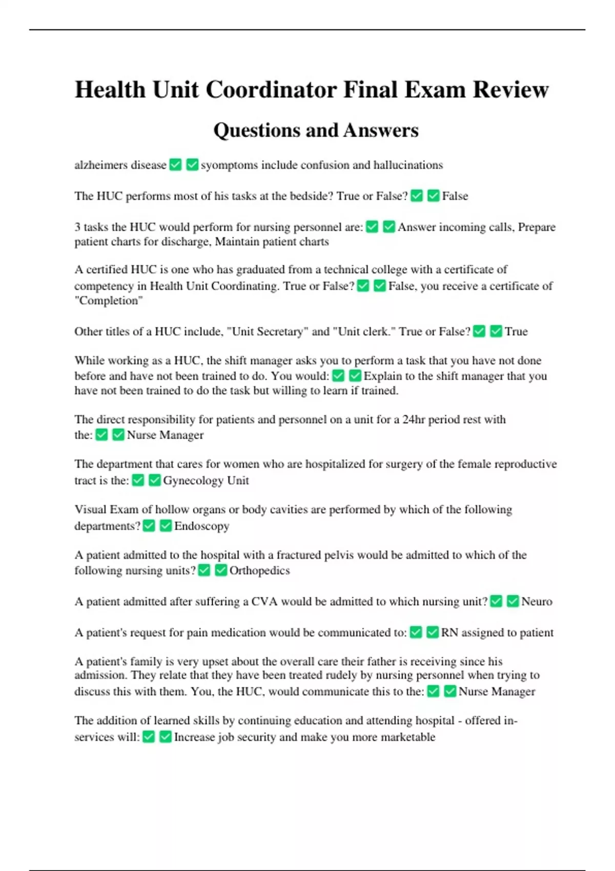 alzheimers disease syomptoms include confusion and hallucinations The HUC performs most of his tasks at the bedside? True or False? False 3 tasks the HUC would perform for nursing personnel are: Answer incoming calls, Prepare patient charts for discharge, Maintain patient charts A certified HUC is one who has graduated from a technical college with a certificate of competency in Health Unit Coordinating. True or False? False, you receive a certificate of "Completion" Other titles of a HUC include, "Unit Secretary" and "Unit clerk." True or False? True While working as a HUC, the shift manager asks you to perform a task that you have not done before and have not been trained to do. You would: Explain to the shift manager that you have not been trained to do the task but willing to learn if trained. The direct responsibility for patients and personnel on a unit for a 24hr period rest with the: Nurse Manager The department that cares for women who are hospitalized for surgery of the female reproductive tract is the: Gynecology Unit Visual Exam of hollow organs or body cavities are performed by which of the following departments? Endoscopy A patient admitted to the hospital with a fractured pelvis would be admitted to which of the following nursing units? Orthopedics A patient admitted after suffering a CVA would be admitted to which nursing unit? Neuro A patient's request for pain medication would be communicated to: RN assigned to patient A patient's family is very upset about the overall care their father is receiving since his admission. They relate that they have been treated rudely by nursing personnel when trying to discuss this with them. You, the HUC, would communicate this to the: Nurse Manager The addition of learned skills by continuing education and attending hospital - offered in- services will: Increase job security and make you more marketable All of the following orders would be sent to the physical medicine department except for: OT for evaluation and recommendations A doctor that specializes in treating cancerous conditions is called a (an): Oncologist An otolaryngologist specializes in the Dx and Tx of the: Ear, Nose, Throat A division of the physical medicine department that treats, evaluates and preserves morale by providing purposeful activities to patients (i.e. CVA or head injury) is: Occupational Therapy Acknowledgement that a hospital has met certain official standards is called: Accreditation The term usually applied to the physician who admits and has ultimate responsibility for the patient while hospitalized is the: Attending Physician An Opthamologist treats diseases of the ear and nose? True or False? False, they treat the eyes Pathologist: Studies alterations of the body caused by disease Urologist: Treats diseases of the male reproductive tract Proctologist: Treats diseases of the rectum Geriatrist: Studies and treats diseases of the aged A patient receiving liquid nutrient through an artificial opening in the stomach wall is receiving a/an: Gastrostomy feeding A doctor's order reading "NPO MN" means: Nothing by mouth after midnight Diets that are called special or therapeutic are: Soft, Low residue, Low Na, 1000 cal ADA A doctor's order "DAT" would require the HUC to check with the nurse for specific diet to order. True or False? True Diets that may be ordered by the nurse for a patient who may have "diet as tolerated" are: Clear liquid diet, full liquid, soft and general A patient ordered "sips and chips" may have sips of: Water and ice ch