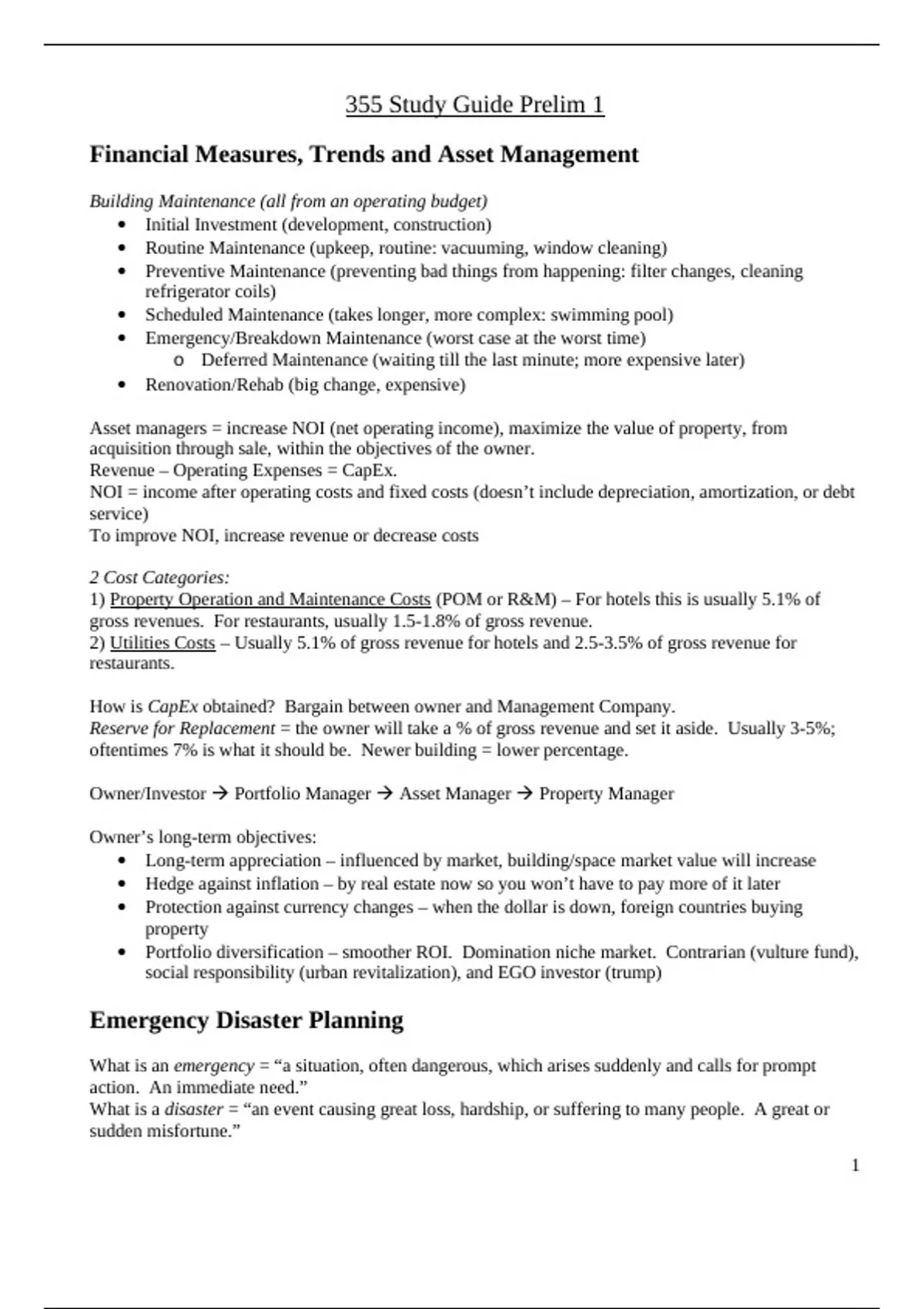 355 Study Guide Prelim 1 Financial Measures, Trends and Asset Management Building Maintenance (all from an operating budget) • Initial Investment (development, construction) • Routine Maintenance (upkeep, routine: vacuuming, window cleaning) • Preventive Maintenance (preventing bad things from happening: filter changes, cleaning refrigerator coils) • Scheduled Maintenance (takes longer, more complex: swimming pool) • Emergency/Breakdown Maintenance (worst case at the worst time) o Deferred Maintenance (waiting till the last minute; more expensive later) • Renovation/Rehab (big change, expensive) Asset managers = increase NOI (net operating income), maximize the value of property, from acquisition through sale, within the objectives of the owner. Revenue – Operating Expenses = CapEx. NOI = income after operating costs and fixed costs (doesn’t include depreciation, amortization, or debt service) To improve NOI, increase revenue or decrease costs 2 Cost Categories: 1) Property Operation and Maintenance Costs (POM or R&M) – For hotels this is usually 5.1% of gross revenues. For restaurants, usually 1.5-1.8% of gross revenue. 2) Utilities Costs – Usually 5.1% of gross revenue for hotels and 2.5-3.5% of gross revenue f