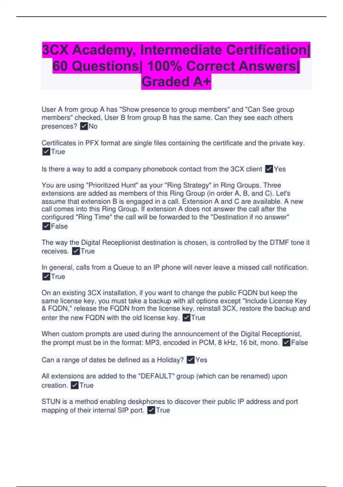 3CX Academy, Intermediate Certification| 60 Questions| 100% Correct Answers| Graded A+