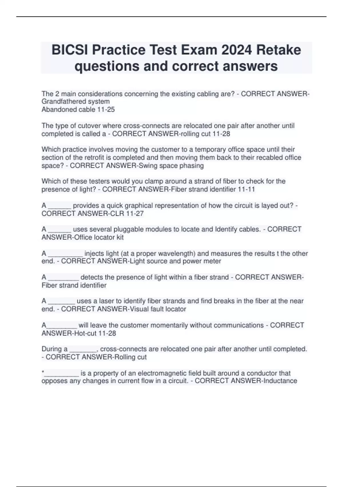BICSI Practice Test Exam 2024 Retake questions and correct answers The 2 main considerations concerning the existing cabling are? - CORRECT ANSWERGrandfathered system Abandoned cable 11-25 The type of cutover where cross-connects are relocated one pair after another until completed is called a - CORRECT ANSWER-rolling cut 11-28 Which practice involves moving the customer to a temporary office space until their section of the retrofit is completed and then moving them back to their recabled office space? - CORRECT ANSWER-Swing space phasing Which of these testers would you clamp around a strand of fiber to check for the presence of light? - CORRECT ANSWER-Fiber strand identifier 11-11 A ______ provides a quick graphical representation of how the circuit is layed out? - CORRECT ANSWER-CLR 11-27 A ______ uses several pluggable modules to locate and Identify cables. - CORRECT ANSWER-Office locator kit A _________ injects light (at a proper wavelength) and measures the results t the other end. - CORRECT ANSWER-Light source and power meter A ________ detects the presence of light within a fiber strand - CORRECT ANSWERFiber strand identifier A _______ uses a laser to identify fiber strands and find breaks in the fiber at the near end. - CORRECT ANSWER-Visual fault locator A________ will leave the customer momentarily without communications - CORRECT ANSWER-Hot-cut 11-28 During a _______, cross-connects are relocated one pair after another until completed. - CORRECT ANSWER-Rolling cut *_________ is a property of an electromagnetic field built around a conductor that opposes any changes in current flow in a circuit. - CORRECT ANSWER-Inductance ____________ is a property of conductors that allows storage of electrical charges when potential differences (voltages) exist between the conductors. - CORRECT ANSWER-Capacitance *In AC circuits, the total opposition to current flow is called _________, which is measured in ohms. - CORRECT ANSWER-Impedanc