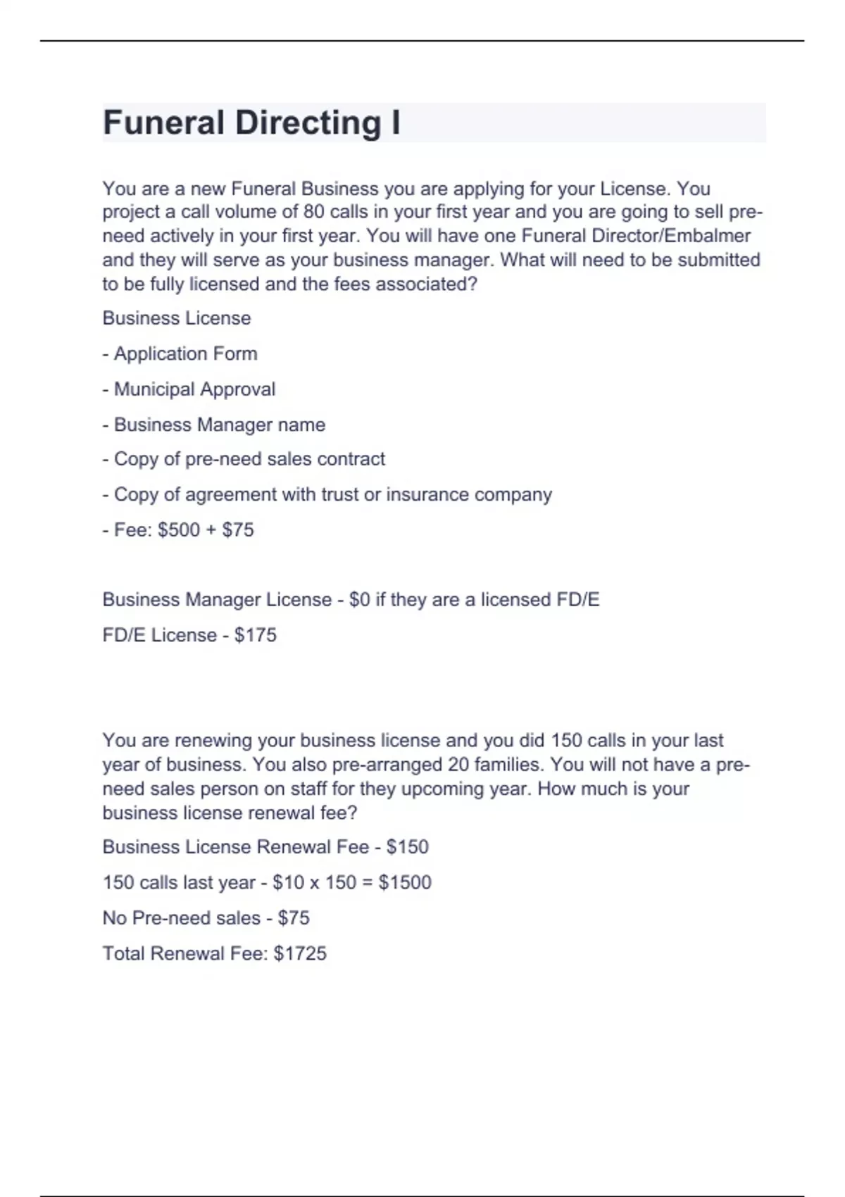 Funeral Directing IYou are a new Funeral Business you are applying for your License. You project a call volume of 80 calls in your first year and you are going to sell pre-need actively in your first year. You will have one Funeral Director/Embalmer and they will serve as your business manager. What will need to be submitted to be fully licensed and the fees associated? Business License - Application Form - Municipal Approval - Business Manager name - Copy of pre-need sales contract - Copy of agreement with trust or insurance company - Fee: $500 + $75 Business Manager License - $0 if they are a licensed FD/E FD/E License - $175 You are renewing your business license and you did 150 calls in your last year of business. You also pre-arranged 20 families. You will not have a pre-need sales person on staff for they upcoming year. How much is your business license renewal fee? Business License Renewal Fee - $150 150 calls last year - $10 x 150 = $1500 No Pre-need sales - $75 Total Renewal Fee: $1725
