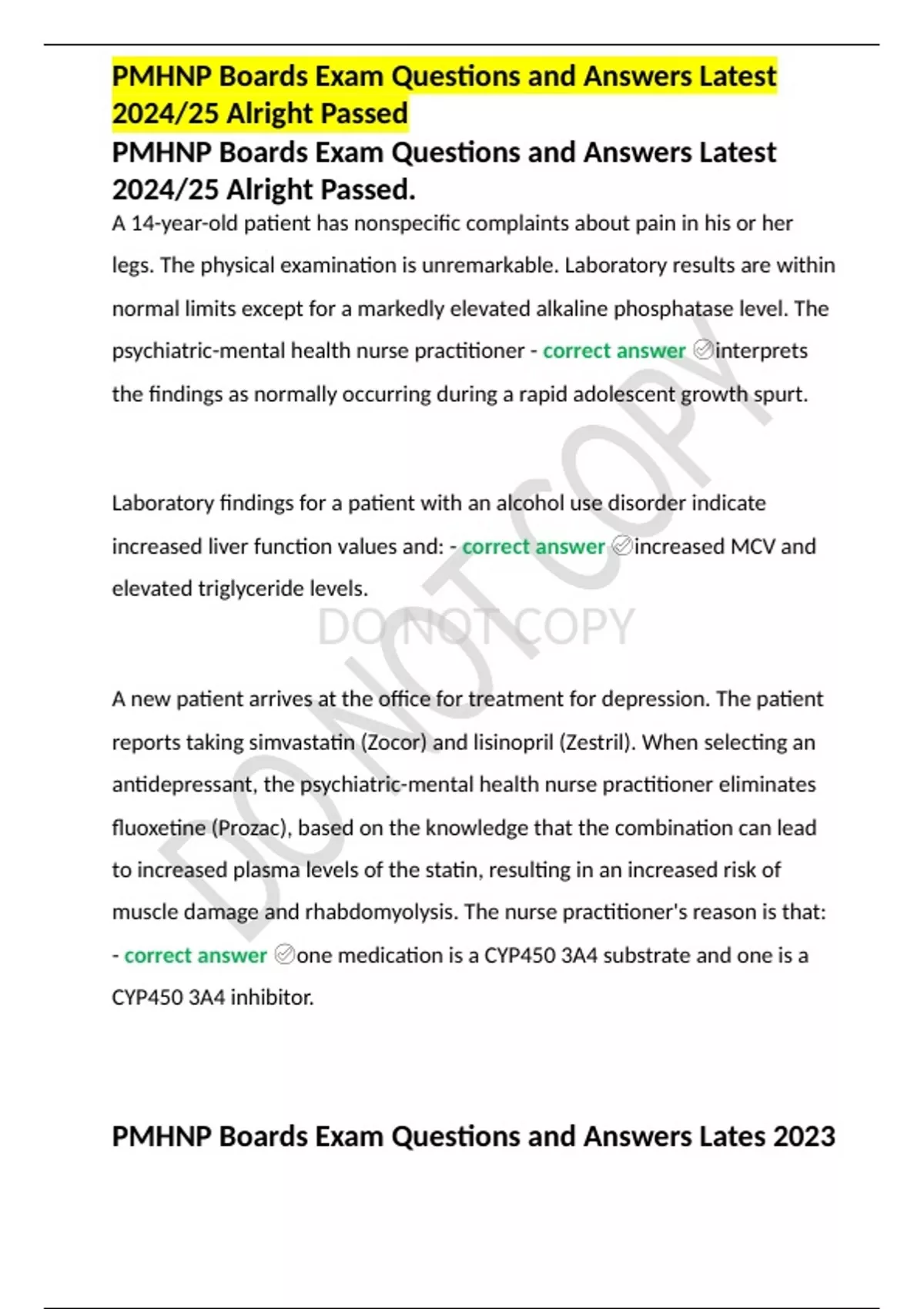 PMHNP Boards Exam Questions and Answers Latest 2024/25 Alright Passed.