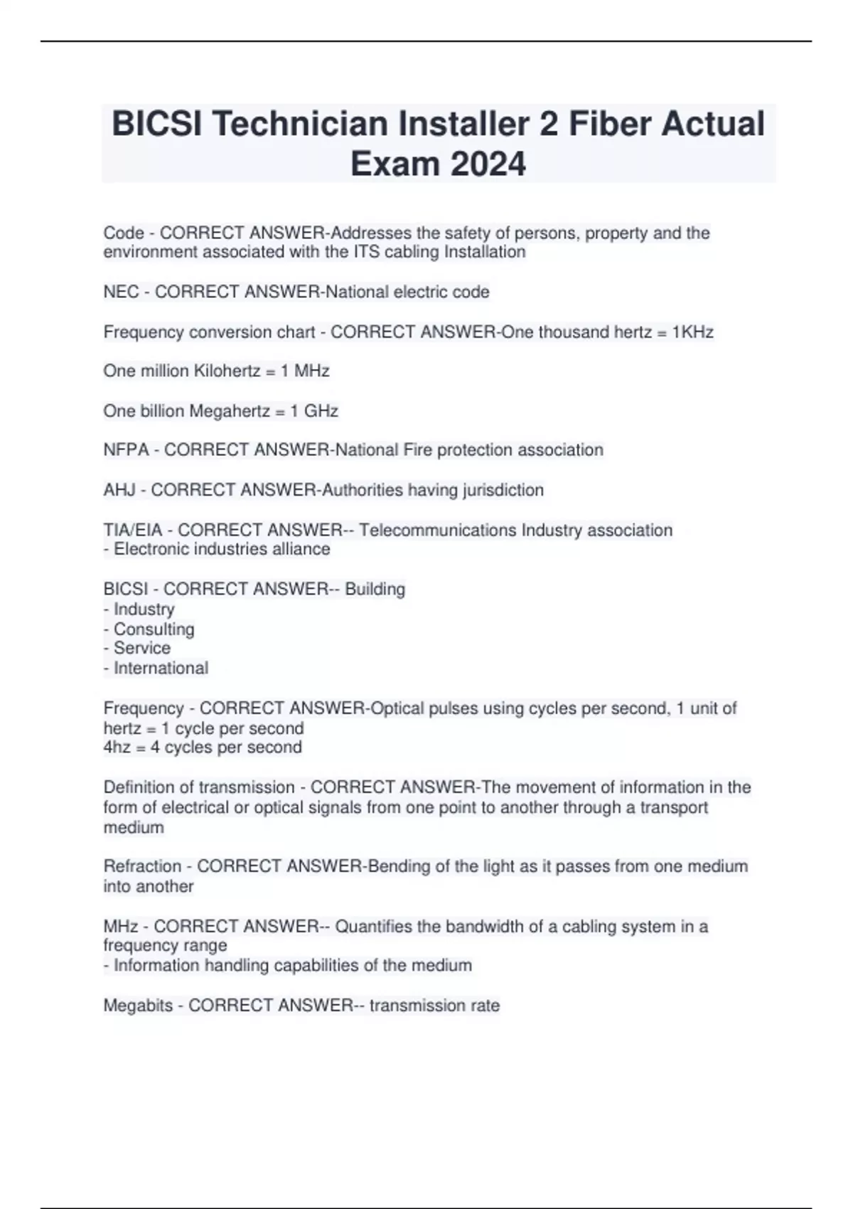 BICSI Technician Installer 2 Fiber Actual Exam 2024 Code - CORRECT ANSWER-Addresses the safety of persons, property and the environment associated with the ITS cabling Installation NEC - CORRECT ANSWER-National electric code Frequency conversion chart - CORRECT ANSWER-One thousand hertz = 1KHz One million Kilohertz = 1 MHz One billion Megahertz = 1 GHz NFPA - CORRECT ANSWER-National Fire protection association AHJ - CORRECT ANSWER-Authorities having jurisdiction TIA/EIA - CORRECT ANSWER-- Telecommunications Industry association - Electronic industries alliance BICSI - CORRECT ANSWER-- Building - Industry - Consulting - Service - International Frequency - CORRECT ANSWER-Optical pulses using cycles per second, 1 unit of hertz = 1 cycle per second 4hz = 4 cycles per second Definition of transmission - CORRECT ANSWER-The movement of information in the form of electrical or optical signals from one point to another through a transport medium Refraction - CORRECT ANSWER-Bending of the light as it passes from one medium into another MHz - CORRECT ANSWER-- Quantifies the bandwidth of a cabling system in a frequency range - Information handling capabilities of the medium Megabits - CORRECT ANSWER-- tran