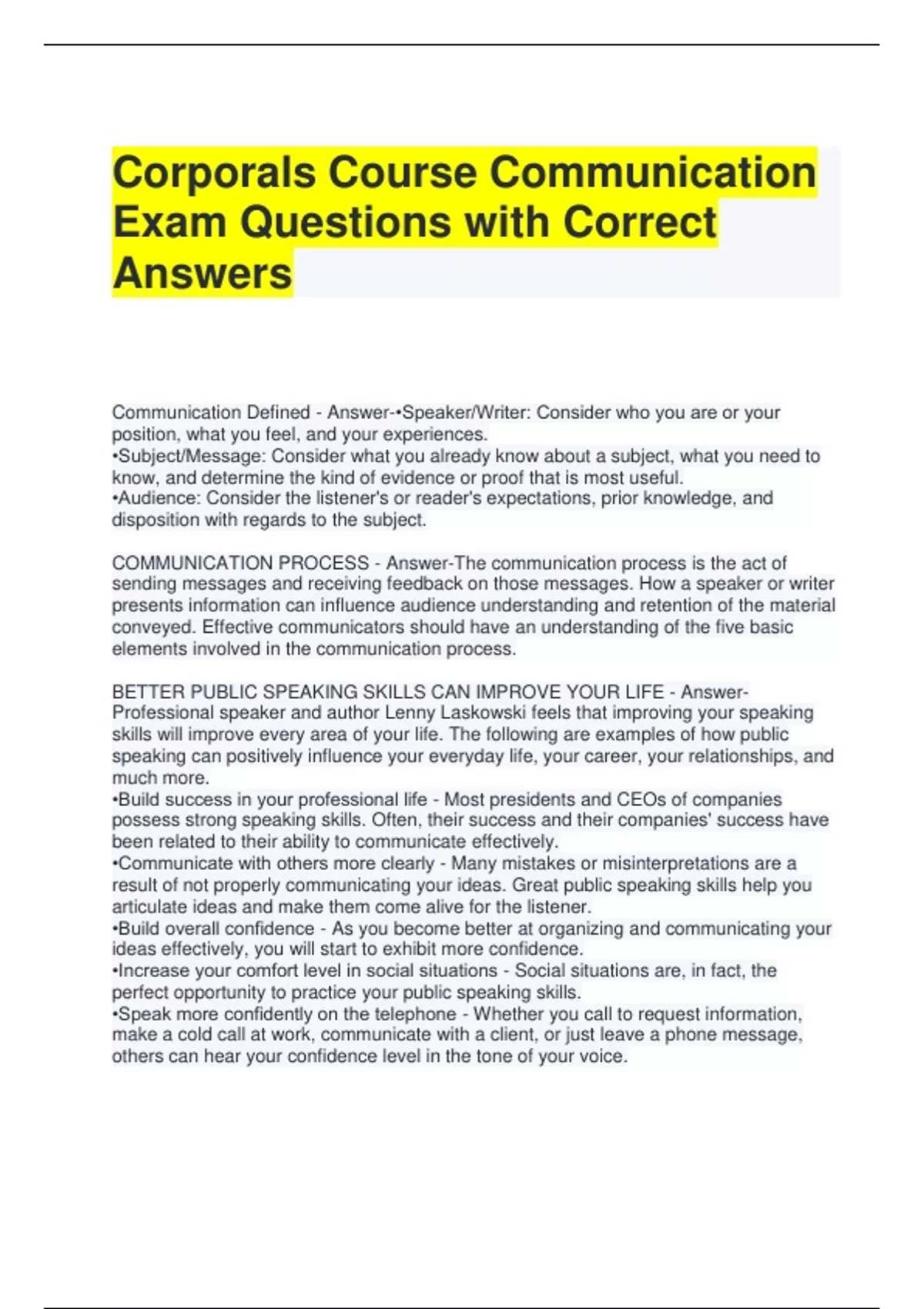 Corporals Course Communication Exam Questions with Correct Answers Communication Defined - Answer-•Speaker/Writer: Consider who you are or your position, what you feel, and your experiences. •Subject/Message: Consider what you already know about a subject, what you need to know, and determine the kind of evidence or proof that is most useful. •Audience: Consider the listener's or reader's expectations, prior knowledge, and disposition with regards to the subject. COMMUNICATION PROCESS - Answer-The communication process is the act of sending messages and receiving feedback on those messages. How a speaker or writer presents information can influence audience understanding and retention of the material conveyed. Effective communicators should have an understanding of the five basic elements involved in the communication process. BETTER PUBLIC SPEAKING SKILLS CAN IMPROVE YOUR LIFE - Answer- Professional speaker and author Lenny Laskowski feels that improving your speaking skills will improve every area of your life. The following are examples of how public speaking can positively influence your everyday life, your career, your relationships, and much more. •Build success in your professional life - Most presidents and CEOs of companies possess strong speaking skills. Often, their success and their companies' success have been related to their ability to communicate effectively. •Communicate with others more clearly - Many mistakes or misinterpretations are a result of not properly communicating your ideas. Great public speaking skills help you articulate ideas and make them come alive for the listener. •Build overall confidence - As you become better at organizing and communicating your ideas effectively, you will start to exhibit more confidence. •Increase your comfort level in social situations - Social situations are, in fact, the perfect opportunity to practice your public speaking skills. •Speak more confidently on the telephone - Whether you call to request information, make a cold call at work, communicate with a client, or just leave a phone message, others can hear your confidence level in the tone of your voice. •Establish trust and respect from others with greater ease - The ability to convince people with words is vital to establishing trust and respect. This can include not only what you say, but how you say it. STEPS TO FOLLOW FOR A PRESENTATION - Answer-When tasked with making a presentation, follow the three basic steps of plan, prepare, and deliver. The steps will be described further in this lesson. •Plan - Determine the purpose. - Select the topic. - Determine the main point or central idea. - Conduct research. •Prepare - Prepare a written outline. - Prepare speaker notes. - Rehearse the presentation . •Deliver - Use effective communication techniques. - Understand the principles of effective communication. Planning Considerations - Answer-Audience The speaker should consider a number of factors about the audience so they can relate to them during the presentation. •Demographics: Get to know your audience. Analyzing the audience helps the speaker adapt their message to the listeners more effectively. If possible, determine their age range, gender, group membership, education, and cultural and ethnic background. •Values: Get to know the values and interests of your audience since audiences pay closer attention to messages that are tailored to their values, beliefs, and interests. •Audience Needs: Know the needs of your audience. Audiences value their time and cease to listen when they feel their time is not being used wisely. •Audience Knowledge: Get to know the current knowledge and experience level of your audience. Audiences hear and evaluate what a speaker says on the basis of what they already know and believe, so it is easier to build a presentation that reinforces rather than convinces. Planning considerations cont. - Answer-Situation The speaker should consider a number of factors when analyzing the situation surrounding a planned presentation. •Time: How long does the speaker have to speak? •Size: What is the expected size of the audience? •Facilities: What is the capacity of the room/space and the seating arrangements? •Equipment: What equipment is available and needed? •Physical conditions: What are the environmental factors of the location such as temperature, ventilation, noise distractions, and lighting? DETERMINE THE PURPOSE - Answer-Once tasked with making a presentation, the speaker will need to determine the purpose for giving the presentation. The most common purposes for public speaking include: •To persuade: This approach is used to sell the audience on a new idea, or a change in operations. The goal is to influence audience beliefs or actions. •To inform: Use this approach when you need to pass on new or additional information. The goal is to expand audience knowledge. The emphasis is clear, direct communication with accurate and adequate information tailored to audience education and skill levels. Audience feedback may be needed in some situations to make sure the message is received. •To entertain: The goal of entertaining speeches is to amuse the audience and provide enjoyment. This method is used on special occasions but is rarely used alone. The purpose of entertaining is often secondary to either the purpose of informing or persuasion. The focus of this method of communication is delivery. People will likely be more interested in what the speaker has to say when the presentation provides enjoyment. SELECT THE TOPIC - Answer-A well-chosen topic is the first step to a successful presentation. In the military, often, the topic of the presentation is directed from higher authority. If you can choose the topic, begin by asking yourself several questions. Your answers will help you select a topic. •What topics are you experienced with? •What are you interested in talking about? •Does the occasion o