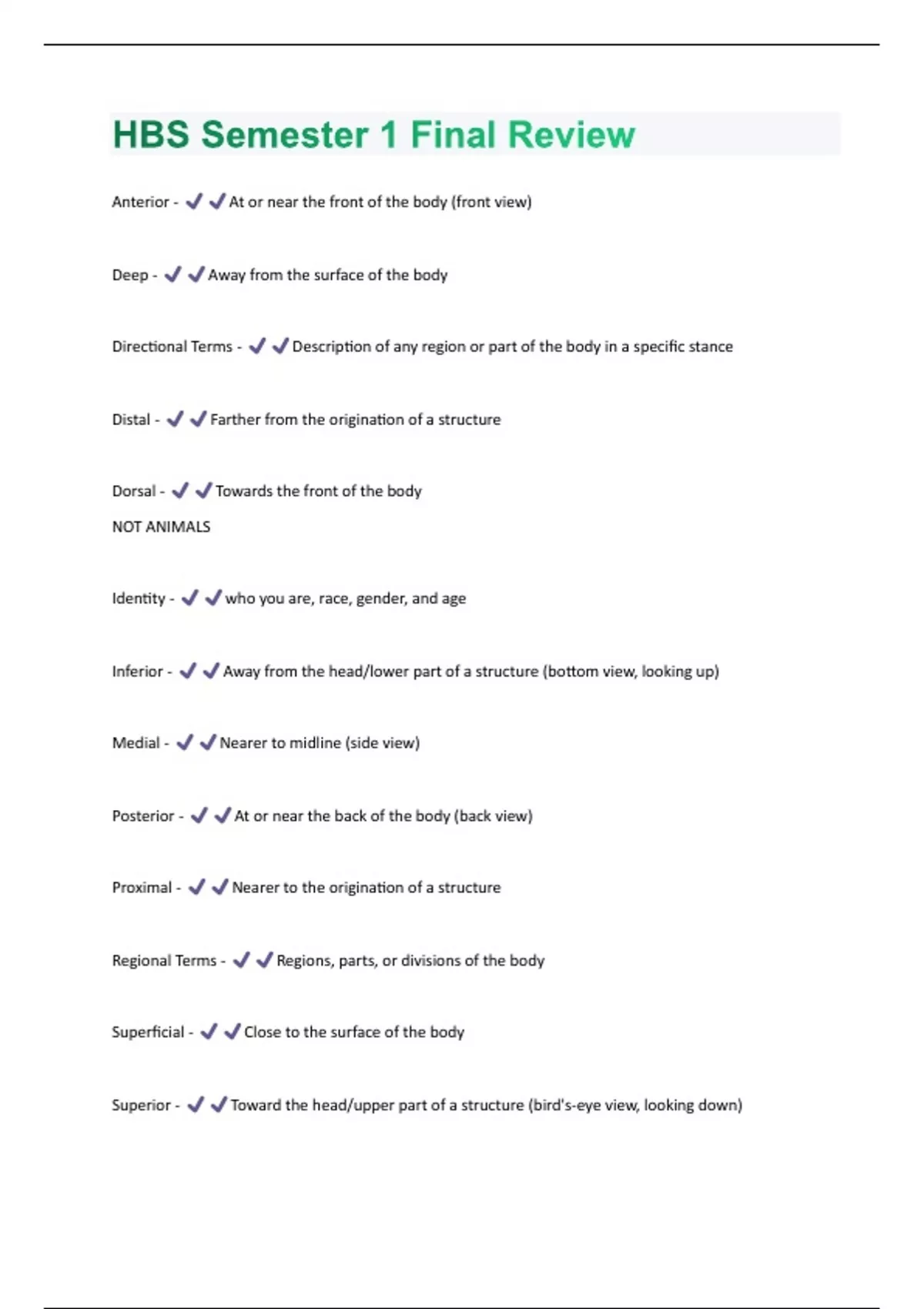 Anterior - At or near the front of the body (front view) Deep - Away from the surface of the body Directional Terms - Description of any region or part of the body in a specific stance Distal - Farther from the origination of a structure Dorsal - Towards the front of the body NOT ANIMALS Identity - who you are, race, gender, and age Inferior - Away from the head/lower part of a structure (bottom view, looking up) Medial - Nearer to midline (side view) Posterior - At or near the back of the body (back view) Proximal - Nearer to the origination of a structure Regional Terms - Regions, parts, or divisions of the body Superficial - Close to the surface of the body Superior - Toward the head/upper part of a structure (bird's-eye view, looking down)System - A group of physiologically or anatomically related organs or parts Ventral - Toward the back of the body NOT ANIMALS Adipose Tissue - Loose connective tissue composed of adipocytes Main role is to store energy in the form of fat, although it also cushions and insulates the body Appendicular Skeleton - Portion of the skeleton of vertebrates consisting of the bones or cartilage that support the appendages Axial Skeleton - Part of the skeleton that consists of the bones of the head and trunk of a vertebrate Connective Tissue - Serves a "connecting" function Supports and binds other tissues in the body. as cells scattered throughout an extracellular matrix Holds organs in place and attaches epithelial tissue to other underlying tissues Epithelial tissue - A sheet of cells that covers a body surface or lines a body cavity Cells packed tightly together Forms the outer layer of the skin; lines open cavities of the digestive and respiratory systems; covers the walls of organs of the closed ventral body cavity.Femur - Used to determine age Forensic Anthropology - The study of human remains That involves applying skeletal analysis and techniques in archaeology to solving criminal cases study bones, a field known as osteology, and profile research subjects by gathering information used to determine the individual's age at death, sex and physical condition Humerus - Used to determine age Pelvis - Used to determine sex Skull - Used to determine race Tibia - Used to determine height Tissue - any of the distinct types of material of which animals or plants are made, consisting of specialized cells and their products Argarose - Used as a diagnostic tool to visualize the fragments. An electric current is used to move the DNA molecules across which is a polysaccharide matrix that functions as a sort of sieve. Biometrics - the measurement and statistical analysis of people's physical and behavioral characteristics mainly used for identification and access control, or for identifying individuals that are under surveillanceThe basic premise of biometric authentication is that everyone is unique and an individual can be identified by his or her intrinsic physical or behavioral traits. DNA - Deoxyribonucleic acid a molecule that carries the genetic instructions used in the growth, development, functioning and reproduction of all known living organisms and many viruses Gel Electrophoresis - a laboratory method used to separate mixtures of DNA, RNA, or proteins according to molecular size