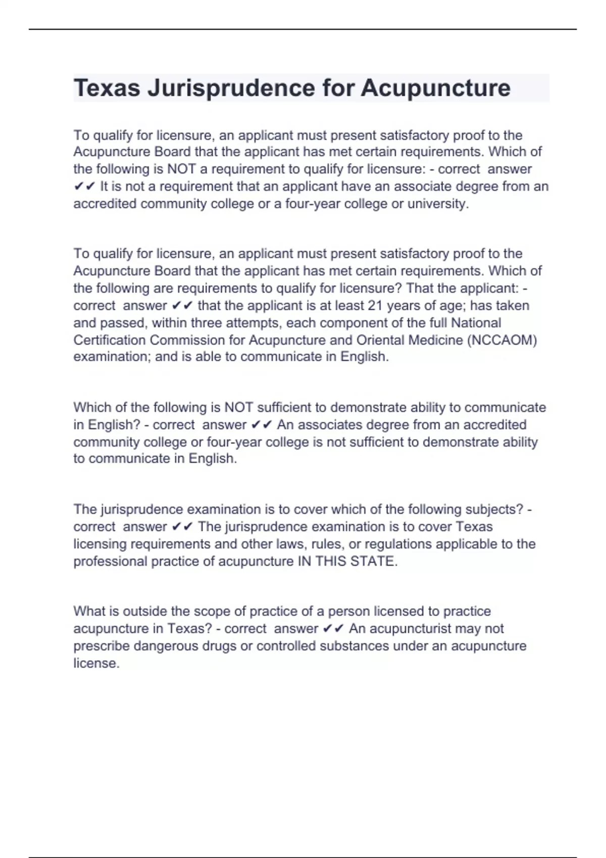 Texas Jurisprudence for AcupunctureTo qualify for licensure, an applicant must present satisfactory proof to the Acupuncture Board that the applicant has met certain requirements. Which of the following is NOT a requirement to qualify for licensure: - correct answer It is not a requirement that an applicant have an associate degree from an accredited community college or a four-year college or university. To qualify for licensure, an applicant must present satisfactory proof to the Acupuncture Board that the applicant has met certain requirements. Which of the following are requirements to qualify for licensure? That the applicant: - correct answer that the applicant is at least 21 years of age; has taken and passed, within three attempts, each component of the full National Certification Commission for Acupuncture and Oriental Medicine (NCCAOM) examination; and is able to communicate in English. Which of the following is NOT sufficient to demonstrate ability to communicate in English? - correct answer An associates degree from an accredited community college or four-year college is not sufficient to demonstrate ability to communicate in English. The jurisprudence examination is to cover which of the following subjects? - correct answer The jurisprudence examination is to cover Texas licensing requirements and other laws, rules, or regulations applicable to the professional practice of acupuncture IN THIS STATE. What is outside the scope of practice of a person licensed to practice acupuncture in Texas? - correct answer An acupuncturist may not prescribe dangerous drugs or controlled substances under an acupuncture license.