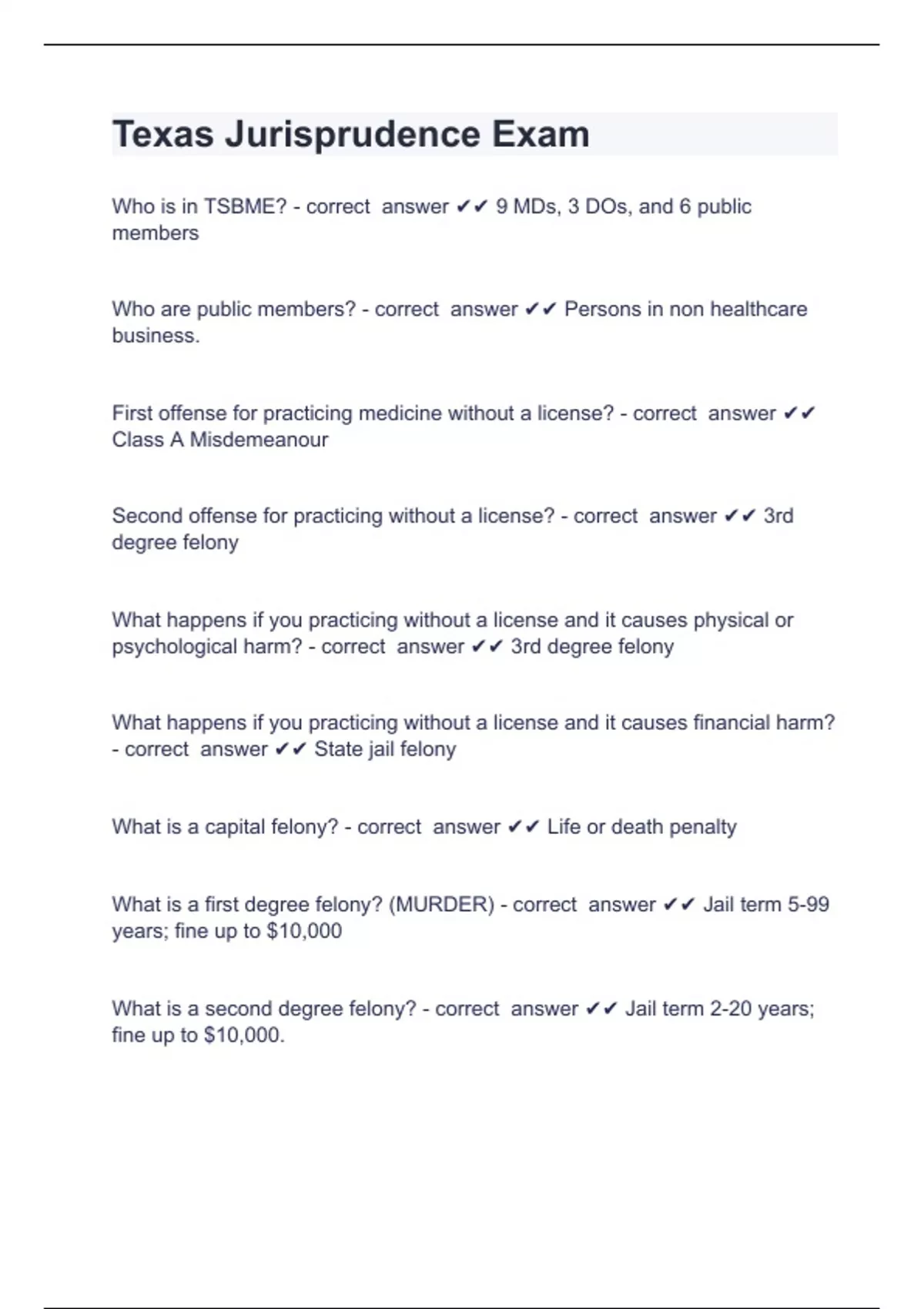 Texas Jurisprudence Exam Who is in TSBME? - correct answer 9 MDs, 3 DOs, and 6 public members Who are public members? - correct answer Persons in non healthcare business. First offense for practicing medicine without a license? - correct answer Class A Misdemeanour Second offense for practicing without a license? - correct answer 3rd degree felony What happens if you practicing without a license and it causes physical or psychological harm? - correct answer 3rd degree felony What happens if you practicing without a license and it causes financial harm? - correct answer State jail felony What is a capital felony? - correct answer Life or death penalty What is a first degree felony? (MURDER) - correct answer Jail term 5-99 years; fine up to $10,000 What is a second degree felony? - correct answer Jail term 2-20 years; fine up to $10,000.