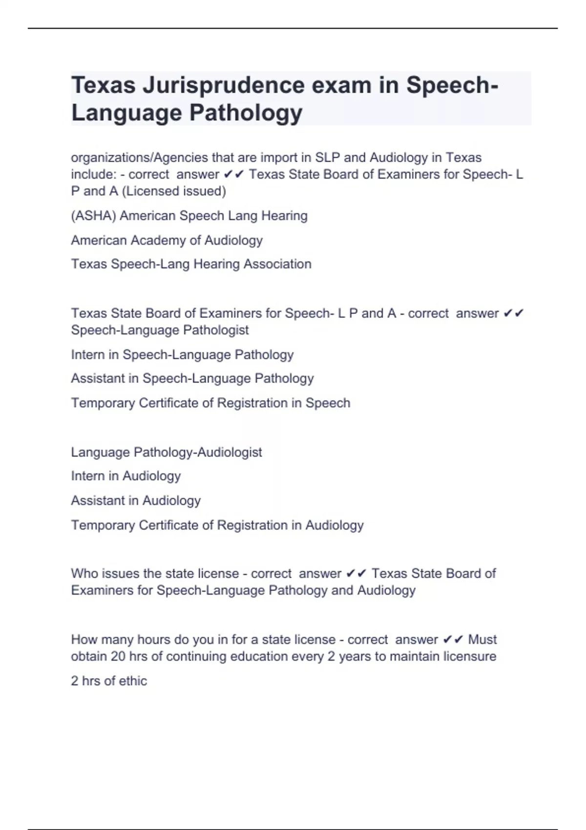 Texas Jurisprudence exam in Speech-Language Pathology organizations/Agencies that are import in SLP and Audiology in Texas include: - correct answer Texas State Board of Examiners for Speech- L P and A (Licensed issued) (ASHA) American Speech Lang Hearing American Academy of Audiology Texas Speech-Lang Hearing Association Texas State Board of Examiners for Speech- L P and A - correct answer Speech-Language Pathologist Intern in Speech-Language Pathology Assistant in Speech-Language Pathology Temporary Certificate of Registration in Speech Language Pathology-Audiologist Intern in Audiology Assistant in Audiology Temporary Certificate of Registration in Audiology Who issues the state license - correct answer Texas State Board of Examiners for Speech-Language Pathology and Audiology How many hours do you in for a state license - correct answer Must obtain 20 hrs of continuing education every 2 years to maintain licensure 2 hrs of ethic When do you renew the SLP/Aud and Assistant License - correct answer every two years on your birthday Do you need a License in the state of Texas to practice as an Aud/SLP/intern/or assistant - correct answer Yes What happens if you practice without a license - correct answer Class B misdemeanor (punishable by 6 months in county jail and/or fine not exceeding $1,000) Once you hired you apply for Assistant Application what is the process - correct answer -Application & Fee -Official transcript showing baccalaureate degree(s) conferred -Supervisory Responsibility Statement Form (whoever hires you) -Proof of Completion of Jurisprudence Exam -DPS/FBI - Fingerprinting -Clinical Observation & Experience Form completed by university program director- this documents how many clinical observation hours and clinical assisting experience hours you received (Submit Clinical Deficiency Plan if you did not complete all the clinical observation hours & clinical experience hours at the university) If a student did not complete all the clinical hours and clinical experience hours, what do they submit? - correct answer Clinical Deficiency Plan It's a form that documents how many hours you received. - correct answer What is the clinical and observation form?