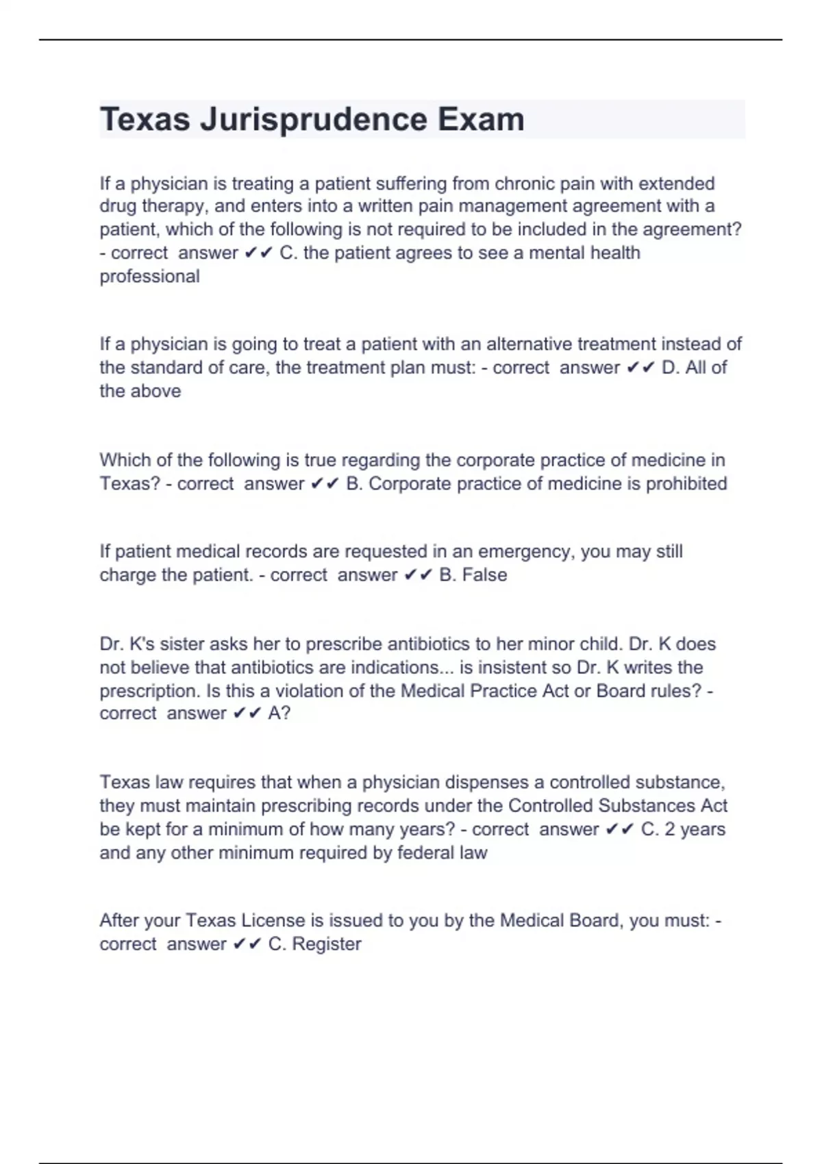 Texas Jurisprudence ExamIf a physician is treating a patient suffering from chronic pain with extended drug therapy, and enters into a written pain management agreement with a patient, which of the following is not required to be included in the agreement? - correct answer C. the patient agrees to see a mental health professional If a physician is going to treat a patient with an alternative treatment instead of the standard of care, the treatment plan must: - correct answer D. All of the above Which of the following is true regarding the corporate practice of medicine in Texas? - correct answer B. Corporate practice of medicine is prohibited If patient medical records are requested in an emergency, you may still charge the patient. - correct answer B. False Dr. K's sister asks her to prescribe antibiotics to her minor child. Dr. K does not believe that antibiotics are indications... is insistent so Dr. K writes the prescription. Is this a violation of the Medical Practice Act or Board rules? - correct answer A? Texas law requires that when a physician dispenses a controlled substance, they must maintain prescribing records under the Controlled Substances Act be kept for a minimum of how many years? - correct answer C. 2 years and any other minimum required by federal law After your Texas License is issued to you by the Medical Board, you must: - correct answer C. Register
