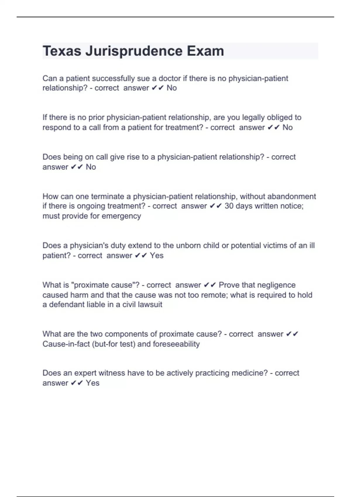 Texas Jurisprudence ExamCan a patient successfully sue a doctor if there is no physician-patient relationship? - correct answer No If there is no prior physician-patient relationship, are you legally obliged to respond to a call from a patient for treatment? - correct answer No Does being on call give rise to a physician-patient relationship? - correct answer No How can one terminate a physician-patient relationship, without abandonment if there is ongoing treatment? - correct answer 30 days written notice; must provide for emergency Does a physician's duty extend to the unborn child or potential victims of an ill patient? - correct answer Yes What is "proximate cause"? - correct answer Prove that negligence caused harm and that the cause was not too remote; what is required to hold a defendant liable in a civil lawsuit What are the two components of proximate cause? - correct answer Cause-in-fact (but-for test) and foreseeability Does an expert witness have to be actively practicing medicine? - correct answer Yes