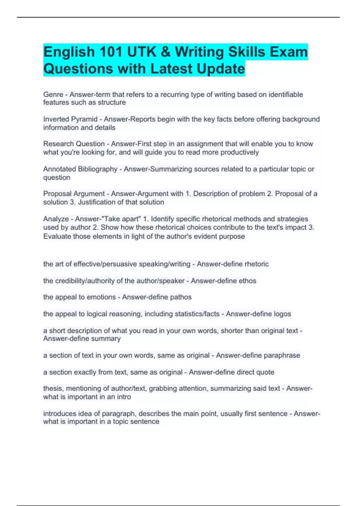 English 101 UTK & Writing Skills Exam Questions with Latest Update