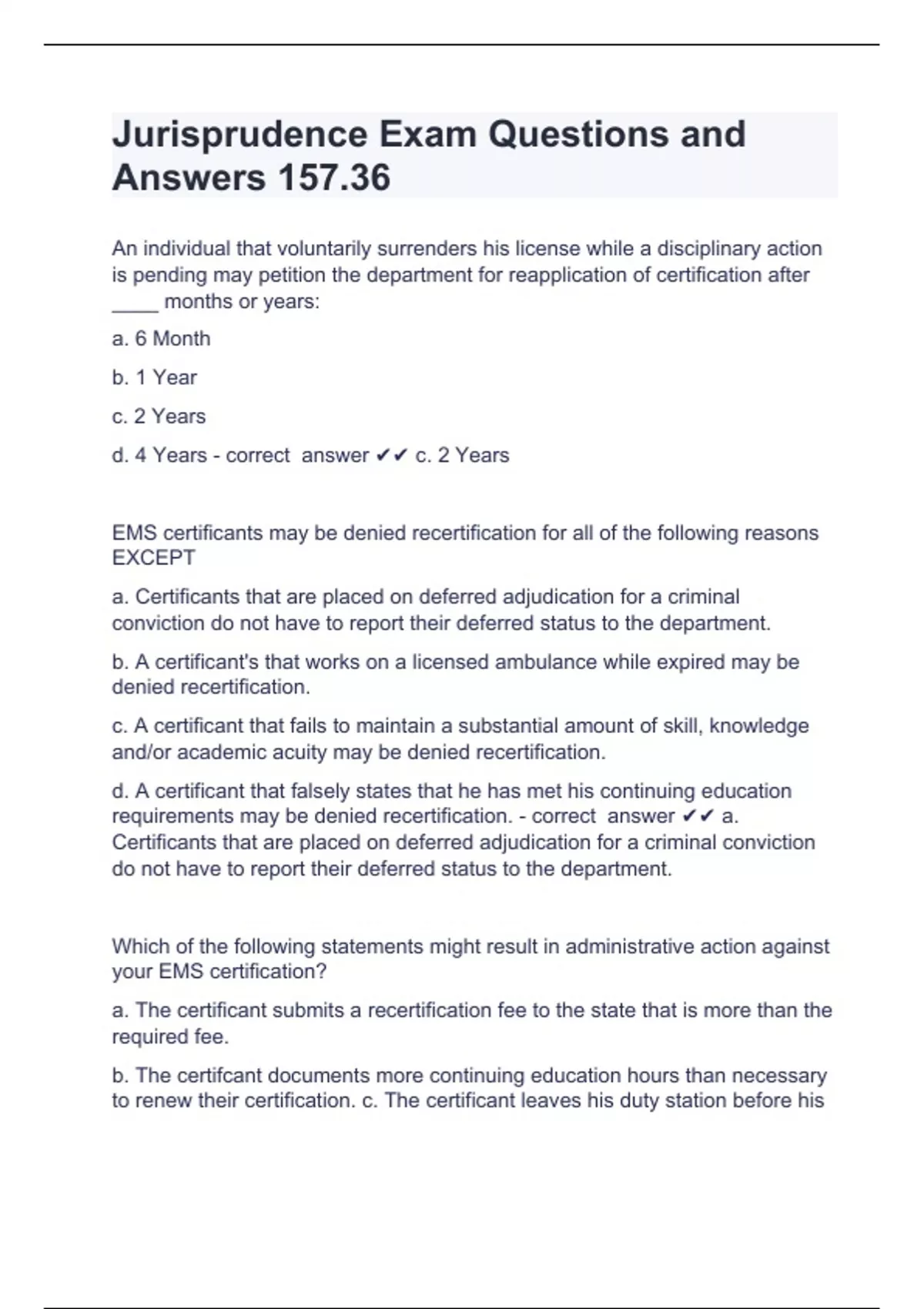 Jurisprudence Exam Questions and Answers 157.36An individual that voluntarily surrenders his license while a disciplinary action is pending may petition the department for reapplication of certification after ____ months or years: a. 6 Month b. 1 Year c. 2 Years d. 4 Years - correct answer c. 2 Years EMS certificants may be denied recertification for all of the following reasons EXCEPT a. Certificants that are placed on deferred adjudication for a criminal conviction do not have to report their deferred status to the department. b. A certificant's that works on a licensed ambulance while expired may be denied recertification. c. A certificant that fails to maintain a substantial amount of skill, knowledge and/or academic acuity may be denied recertification. d. A certificant that falsely states that he has met his continuing education requirements may be denied recertification. - correct answer a. Certificants that are placed on deferred adjudication for a criminal conviction do not have to report their deferred status to the department. Which of the following statements might result in administrative action against your EMS certification? a. The certificant submits a recertification fee to the state that is more than the required fee.