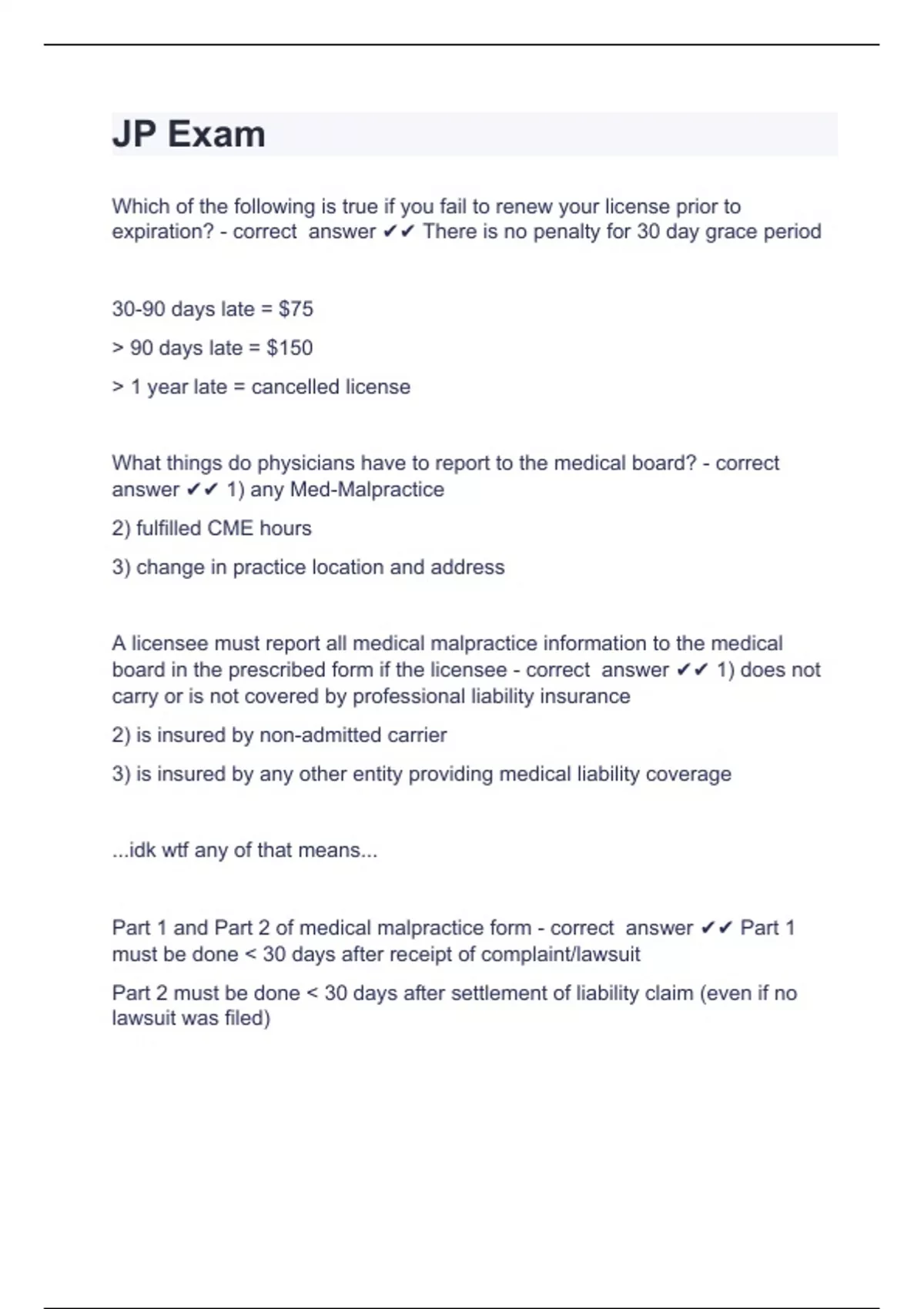 JP Exam Which of the following is true if you fail to renew your license prior to expiration? - correct answer There is no penalty for 30 day grace period 30-90 days late = $75 > 90 days late = $150 > 1 year late = cancelled license What things do physicians have to report to the medical board? - correct answer 1) any Med-Malpractice 2) fulfilled CME hours 3) change in practice location and address A licensee must report all medical malpractice information to the medical board in the prescribed form if the licensee - correct answer 1) does not carry or is not covered by professional liability insurance 2) is insured by non-admitted carrier 3) is insured by any other entity providing medical liability coverage ...idk wtf any of that means... Part 1 and Part 2 of medical malpractice form - correct answer Part 1 must be done < 30 days after receipt of complaint/lawsuit Part 2 must be done < 30 days after settlement of liability claim (even if no lawsuit was filed)