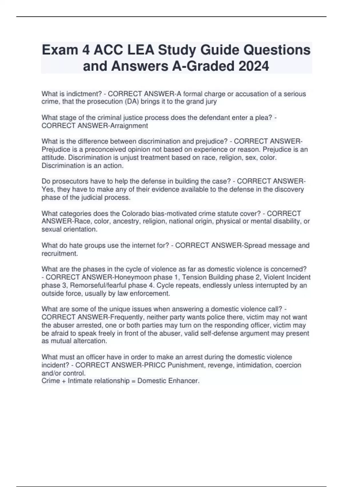 Exam 4 ACC LEA Study Guide Questions and Answers A-Graded 2024 What is indictment? - CORRECT ANSWER-A formal charge or accusation of a serious crime, that the prosecution (DA) brings it to the grand jury What stage of the criminal justice process does the defendant enter a plea? - CORRECT ANSWER-Arraignment What is the difference between discrimination and prejudice? - CORRECT ANSWERPrejudice is a preconceived opinion not based on experience or reason. Prejudice is an attitude. Discrimination is unjust treatment based on race, religion, sex, color. Discrimination is an action. Do prosecutors have to help the defense in building the case? - CORRECT ANSWERYes, they have to make any of their evidence available to the defense in the discovery phase of the judicial process. What categories does the Colorado bias-motivated crime statute cover? - CORRECT ANSWER-Race, color, ancestry, religion, national origin, physical or mental disability, or sexual orientation. What do hate groups use the internet for? - CORRECT ANSWER-Spread message and recruitment. What are the phases in the cycle of violence as far as domestic violence is concerned? - CORRECT ANSWER-Honeymoon phase 1, Tension Building phase 2, Violent Incident phase 3, Remorseful/fearful phase 4. Cycle repeats, endlessly unless interrupted by an outside force, usually by law enforcement. What are some of the unique issues when answering a domestic violence call? - CORRECT ANSWER-Frequently, neither party wants police there, victim may not want the abuser arrested, one or both parties may turn on the responding officer, victim may be afraid to speak freely in front of the abuser, valid self-defense argument may present as mutual altercation. What must an officer have in order to make an arrest during the domestic violence incident? - CORRECT ANSWER-PRICC Punishment, revenge, intimidation, coercion and/or control. Crime + Intimate relationship = Domestic Enhancer. The Americans with Disability Act (ADA) protects a broad range of people. What type of disabilities does ADA cover? - CORRECT ANSWER-Def, Blind, diabetes, autism, epilepsy, cancer, etc...must have physical and/or mental disabilities. Under stress and trauma know what elation is and the behaviors. What are some of the behaviors of confusion? What type of behaviors are associated with confusion? - CORRECT ANSWER-Elation= excited delirium, extreme happiness, and other shit. Confusion= Irrational and erratic behavior, frustration, mystification. What the two levels do people communicate on when they're in a crisis state? - CORRECT ANSWER-Fight or Flight. What communication strategies are suggested during the risk assessment response? - CORRECT ANSWER-Establish credibility, beware of false promises, expect venting, threats and often, "this is none of your business," usually respond to authority figures with opposition, help him or her save face, ALWAYS use caution. What rights are accorded to an adult victim? - CORRECT ANSWER-Status of the case, suspects incarceration and release status, protection, legal counsel, victim advocacy. What is more effective way of saying "Calm Down" to someone? - CORRECT ANSWER-It's going to be alright, what's the matter? What do the letters in the acronym "SAFER" stands for? - CORRECT ANSWERSecurity, Attack, flight, Excessive repetition, Revised priorities. Community Policing is a (Blank) of dealing with problems which effect the community as a whole. - CORRECT ANSWER-Philosophy What was Sir Robert Peel's most important contribution to Policing? - CORRECT ANSWER-Established the fundamentals of modern policing. Community Policing is a way to help the communities solve problems that are related to? - CORRECT ANSWER-Crime and the fear of crime, social and physical disorder, and neighborhood neglect and decay, What are the eight steps in building community partnerships? - CORRECT ANSWERIdentify partners, develop community profile, initiate dialogue, organize community meetings, identify issues, formulate a plan, take action, and then maintenance. What is the definition of Crime Prevention? - CORRECT ANSWER-Is anticipation, recognition, and appraisal of a crime risk and the initiation of some type of action to reduce or remove that risk Know what the four steps in the SARA model are - CORRECT ANSWER-Scanning, Analysis, Response and Assessment What is the definition of a "Problem" under Community Policing? - CORRECT ANSWER-Related incidents, occurring in a community with related characteristics i.e., behavior, location, people and time. The Triangle of Crime and Disorder - What are the words that goes for each side of the triangle? - CORRECT ANSWER-Desire, Ability and Opportunity. Know the numbering system for buildings or area searches, such as A1. - CORRECT ANSWER-Front top level of the building, not always north facing. What are the area searches typically done for? - CORRECT ANSWE