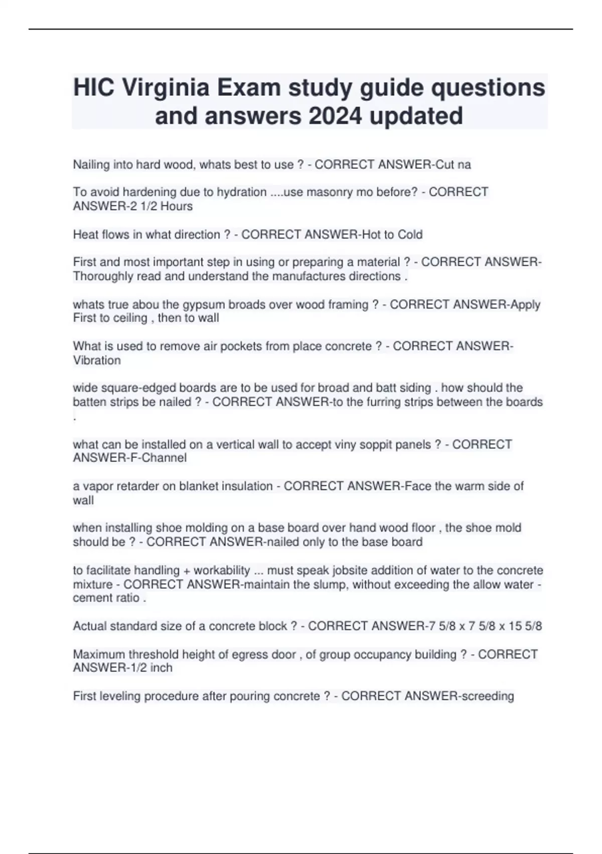 HIC Virginia Exam study guide questions and answers 2024 updated Nailing into hard wood, whats best to use ? - CORRECT ANSWER-Cut na To avoid hardening due to hydration ....use masonry mo before? - CORRECT ANSWER-2 1/2 Hours Heat flows in what direction ? - CORRECT ANSWER-Hot to Cold First and most important step in using or preparing a material ? - CORRECT ANSWERThoroughly read and understand the manufactures directions . whats true abou the gypsum broads over wood framing ? - CORRECT ANSWER-Apply First to ceiling , then to wall What is used to remove air pockets from place concrete ? - CORRECT ANSWERVibration wide square-edged boards are to be used for broad and batt siding . how should the batten strips be nailed ? - CORRECT ANSWER-to the furring strips between the boards . what can be installed on a vertical wall to accept viny sopp