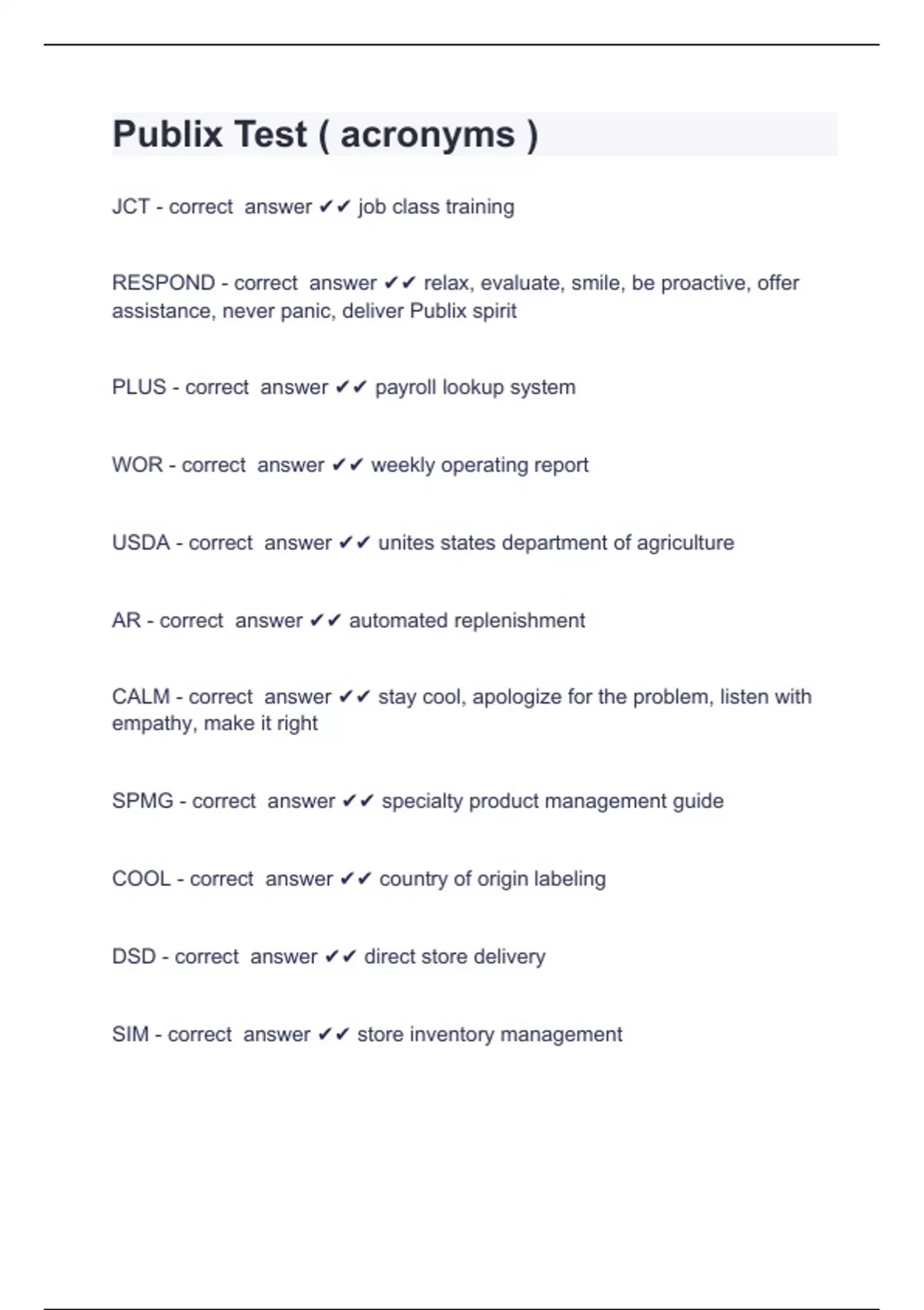 Publix Test ( acronyms )JCT - correct answer job class training RESPOND - correct answer relax, evaluate, smile, be proactive, offer assistance, never panic, deliver Publix spirit PLUS - correct answer payroll lookup system WOR - correct answer weekly operating report USDA - correct answer unites states department of agriculture AR - correct answer automated replenishment CALM - correct answer stay cool, apologize for the problem, listen with empathy, make it right SPMG - correct answer specialty product management guide COOL - correct answer country of origin labeling DSD - correct answer direct store delivery SIM - correct answer store inventory management