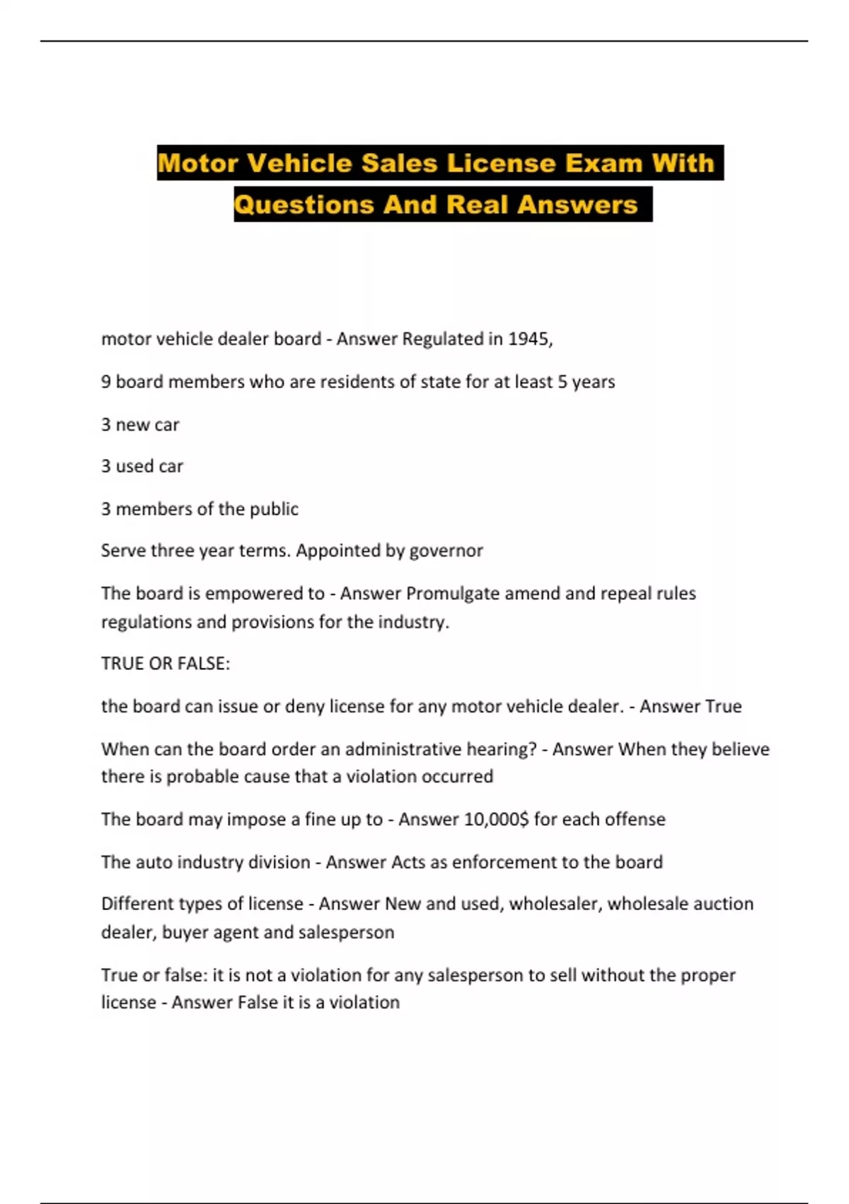 Motor Vehicle Sales License Exam With Questions And Real Answers ...