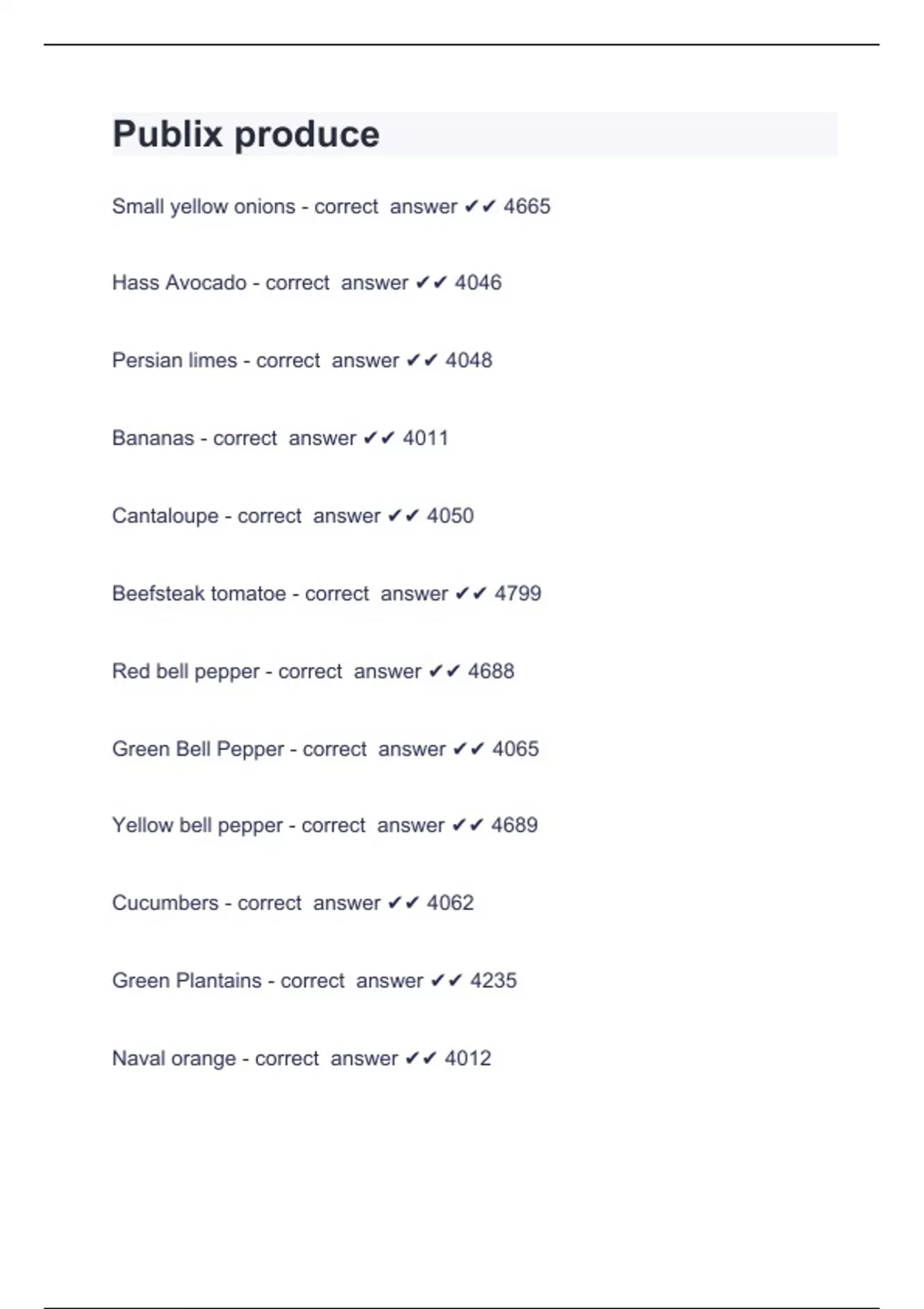 Publix produceSmall yellow onions - correct answer 4665 Hass Avocado - correct answer 4046 Persian limes - correct answer 4048 Bananas - correct answer 4011 Cantaloupe - correct answer 4050 Beefsteak tomatoe - correct answer 4799 Red bell pepper - correct answer 4688 Green Bell Pepper - correct answer 4065 Yellow bell pepper - correct answer 4689 Cucumbers - correct answer 4062 Green Plantains - correct answer 4235 Naval orange - correct answer 4012