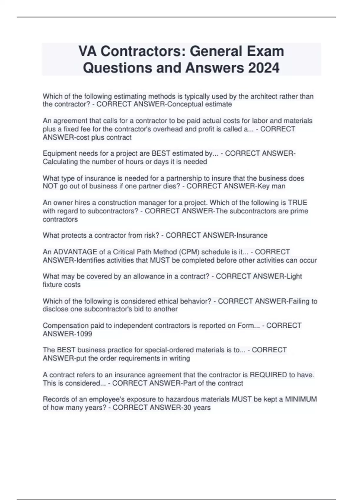 VA Contractors: General Exam Questions and Answers 2024 Which of the following estimating methods is typically used by the architect rather than the contractor? - CORRECT ANSWER-Conceptual estimate An agreement that calls for a contractor to be paid actual costs for labor and materials plus a fixed fee for the contractor's overhead and profit is called a... - CORRECT ANSWER-cost plus contract Equipment needs for a project are BEST estimated by... - CORRECT ANSWERCalculating the number of hours or days it is needed What type of insurance is needed for a partnership to insure that the business does NOT go out of business if one partner dies? - CORRECT ANSWER-Key man An owner hires a construction manager for a project. Which of the following is TRUE with regard to subcontractors? - CORRECT ANSWER-The subcontractors are prime contractors What protects a contractor from risk? - CORRECT ANSWER-Insurance An ADVANTAGE of a Critical Path Method (CPM) schedule is it... - CORRECT ANSWER-Identifies activities that MUST be completed before other activities can occur What may be covered by an allowance in a contract? - CORRECT ANSWER-Light fixture costs Which of the following is considered ethical behavior? - CORRECT ANSWER-Failing to disclose one subcontractor's bid to another Compensation paid to independent contractors is reported on Form... - CORRECT ANSWER-1099 The BEST business practice for special-ordered materials is to... - CORRECT ANSWER-put the order requirements in writing A contract refers to an insurance agreement that the contractor is REQUIRED to have. This is considered... - CORRECT ANSWER-Part of the contract Records of an employee's exposure to hazardous materials MUST be kept a MINIMUM of how many years? - CORRECT ANSW
