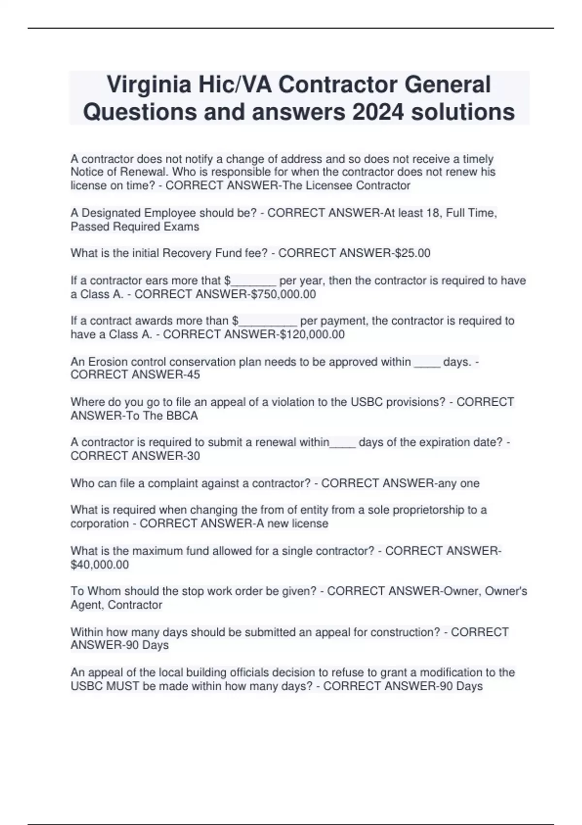 Virginia Hic/VA Contractor General Questions and answers 2024 solutions A contractor does not notify a change of address and so does not receive a timely Notice of Renewal. Who is responsible for when the contractor does not renew his license on time? - CORRECT ANSWER-The Licensee Contractor A Designated Employee should be? - CORRECT ANSWER-At least 18, Full Time, Passed Required Exams What is the initial Recovery Fund fee? - CORRECT ANSWER-$25.00 If a contractor ears more that $_______ per year, then the contractor is required to have a Class A. - CORRECT ANSWER-$750,000.00 If a contract awards more than $_________ per payment, the contractor is required to have a Class A. - CORRECT ANSWER-$120,000.00 An Erosion control conservation plan needs to be approved within ____ days. - CORRECT ANSWER-45 Where do you go to file an appeal of a violation to the USBC provisions? - CORRECT ANSWER-To The BBCA A contractor is required to submit a renewal within____ days of the expiration date? - CORRECT ANSWER-30 Who can file a complaint against a contractor? - CORRECT ANSWER-any one What is required when changing the from of entity from a sole proprietorship to a corporation - CORRECT ANSWER-A new license What is the maximum fund allowed for a single contractor? - CORRECT ANSWER- $40,000.00 To Whom should the stop work order be given? - CORRECT ANSWER-Owner, Owner's Agent, Contractor Within how many days should be submitted an appeal for construction? - CORRECT ANSWER-90 Days