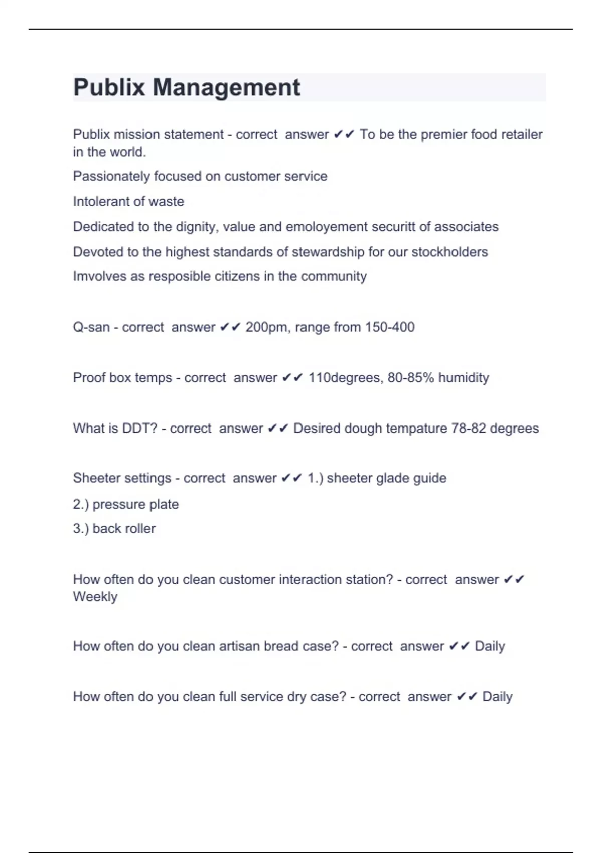 Publix ManagementPublix mission statement - correct answer To be the premier food retailer in the world. Passionately focused on customer service Intolerant of waste Dedicated to the dignity, value and emoloyement securitt of associates Devoted to the highest standards of stewardship for our stockholders Imvolves as resposible citizens in the community Q-san - correct answer 200pm, range from 150-400 Proof box temps - correct answer 110degrees, 80-85% humidity What is DDT? - correct answer Desired dough tempature 78-82 degrees Sheeter settings - correct answer 1.) sheeter glade guide 2.) pressure plate 3.) back roller How often do you clean customer interaction station? - correct answer Weekly How often do you clean artisan bread case? - correct answer Daily How often do you clean full service dry case? - correct answer Daily How often do you clean self service case? - correct answer Daily How often do you clean self service pizza case? - correct answer Daily How often do you clean full service fridge case? - correct answer Daily Minimum tempature for sinks - correct answer Wash: 110 Rinse: 110 Sanitize: 75 How many pedals on a standard rose? - correct answer 12 What percent do you aerate buttercream to? - correct answer 50% What is a plan o gram? - correct answer How to setup bakery products For 20 qt mixer how much buttercream and simple syrup do you use? - correct answer 12lbs. 4 ounces bc icing 10 1/2 oz simple syrup For 12 qt mixer how much buttercream and simple syrup do you use? - correct answer 8lbs. Bc icing 7 ounces simple syrup