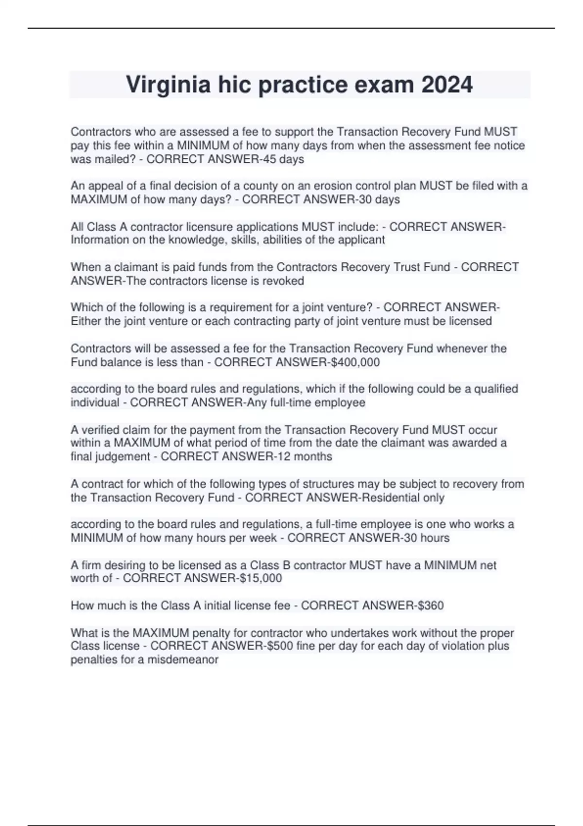Virginia hic practice exam 2024 Contractors who are assessed a fee to support the Transaction Recovery Fund MUST pay this fee within a MINIMUM of how many days from when the assessment fee notice was mailed? - CORRECT ANSWER-45 days An appeal of a final decision of a county on an erosion control plan MUST be filed with a MAXIMUM of how many days? - CORRECT ANSWER-30 days All Class A contractor licensure applications MUST include: - CORRECT ANSWERInformation on the knowledge, skills, abilities of the applicant When a claimant is paid funds from the Contractors Recovery Trust Fund - CORRECT ANSWER-The contractors license is revoked Which of the following is a requirement for a joint venture? - CORRECT ANSWEREither the joint venture or each contracting party of joint venture must be licensed Contractors will be assessed a fee for the Transaction Recovery Fund whenever the Fund balance is less than - CORRECT ANSWER-$400,000 according to the board rules and regulations, which if the following could be a qualified individual - CORRECT ANSWER-Any full-time employee A verified claim for the payment from the Transaction Recovery Fund MUST occur within a MAXIMUM of what period of time from the date the claimant was awarded a final judgement - CORRECT ANSWER-12 months A contract for which of the following types of structures may be subject to recovery from the Transaction Recovery Fund - CORRECT ANSWER-Residential only according to the board rules and regulations, a full-time employee is one who works a MINIMUM of how many hours per week - CORRECT AN