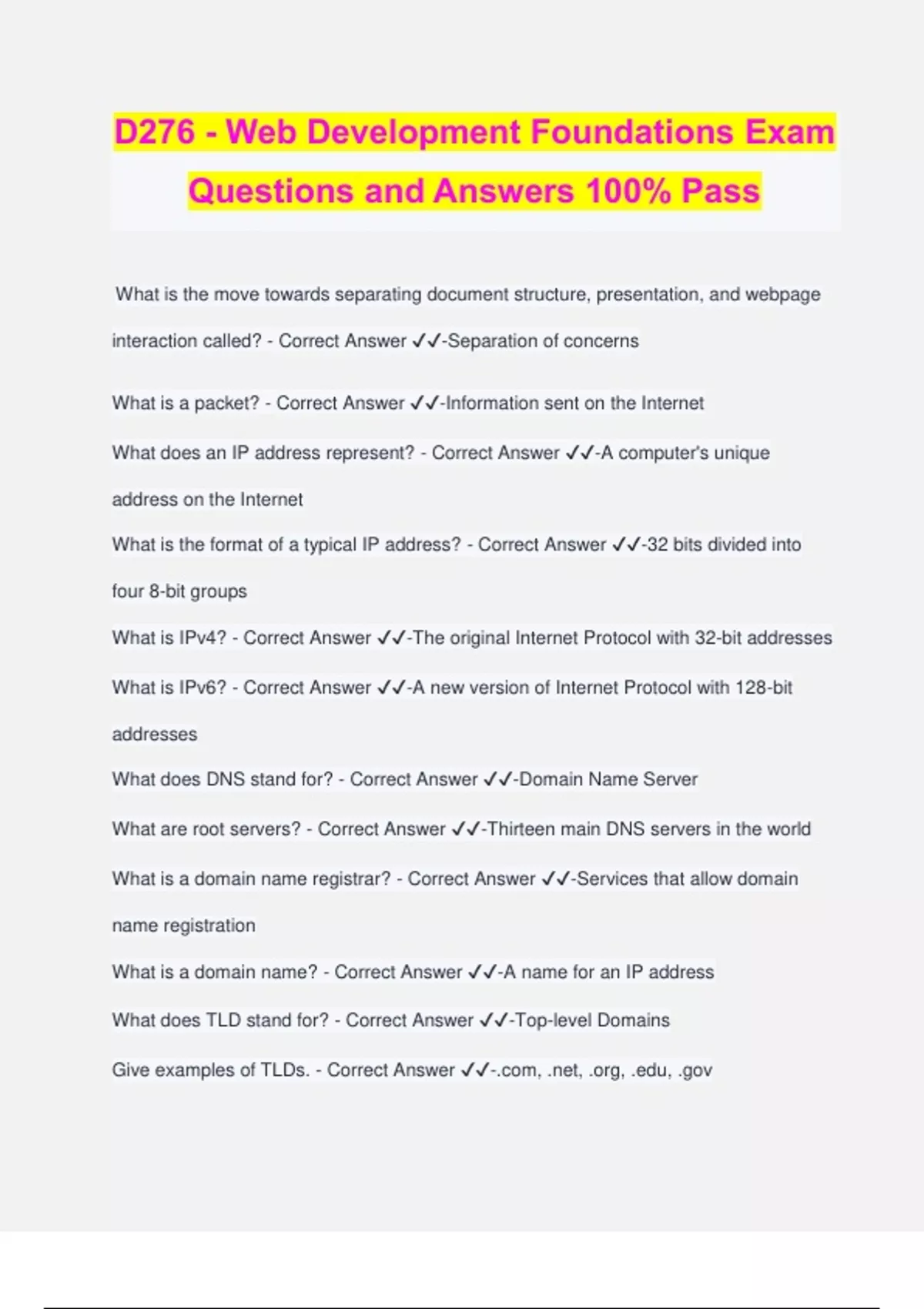 D276 - Web Development Foundations Exam Questions and Answers 100% Pass What is the move towards separating document structure, presentation, and webpage interaction called? - Correct Answer ️️ -Separation of concerns What is a packet? - Correct Answer ️️ -Information sent on the Internet What does an IP address represent? - Correct Answer ️️ -A computer's unique address on the Internet What is the format of a typical IP address? - Correct Answer ️️ -32 bits divided into four 8-bit groups What is IPv4? - Correct Answer ️️ -The original Internet Protocol with 32-bit addresses What is IPv6? - Correct Answer ️️ -A new version of Internet Protocol with 128-bit addresses What does DNS stand for? - Correct Answer ️️ -Domain Name Server What are root servers? - Correct Answer ️️ -Thirteen main DNS servers in the world What is a domain name registrar? - Correct Answer ️️ -Services that allow domain name registration What is a domain name? - Correct Answer ️️ -A name for an IP address What does TLD stand for? - Correct Answer ️️ -Top-level Domains Give examples of TLDs. - Correct Answer ️️ -.com, .net, .org, .edu, .gov What does ccTLD stand for? - Correct Answer ️️ -Country Code Top-Level Domain Give examples of ccTLDs. - Correct Answer ️️ -.uk (United Kingdom), .us (United States), .ru (Russia) What does SLD stand for? - Correct Answer ️️ -Second-Level Domain What is an example of an SLD? - Correct Answer ️️ -'wikipedia' in What does TLD stand for? - Correct Answer ️️ -Third-Level Domain What is an example of a TLD? - Correct Answer ️️ -'www' in What does URL stand for? - Correct Answer ️️ -Uniform Resource Locator What is a URL? - Correct Answer ️️ -The location of a web resource, such as What is a scheme in a URL? - Correct Answer ️️ -Characters at the beginning of a URL followed by a colon (:) or a colon and double slashes (://) Give examples of common schemes. - Correct Answer ️️ -http, https, mailto, file What is a hostname in a URL? - Correct Answer ️️ -The complete domain name following the scheme in a URL What is a path in a URL? - Correct Answer ️️ -The characters to the right of the hostname in a URL What is a query string in a URL? - Correct Answer ️️ -Optional characters to the right of the question mark (?) in a URL that provide data for the web server What is a fragment in a URL? - Correct Answer ️️ -Optional characters at the end of a URL that with a hash character (#) and refer to a certain location within a webpage What is a 404? - Correct Answer ️️ -The status code that a web server returns to a browser when a requested webpage is not found What is linkrot? - Correct Answer ️️ -When content is removed from the web and the URLs that used to point to the content now return a 404 (not found) status co