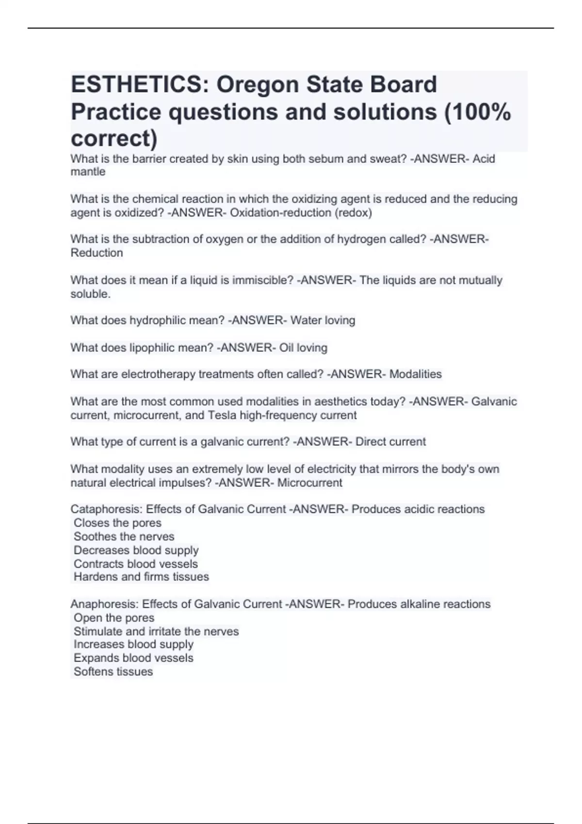 What is the chemical reaction in which the oxidizing agent is reduced and the reducing agent is oxidized? -ANSWER- Oxidation-reduction (redox) What is the subtraction of oxygen or the addition of hydrogen called? -ANSWER- Reduction What does it mean if a liquid is immiscible? -ANSWER- The liquids are not mutually soluble. What does hydrophilic mean? -ANSWER- Water loving What does lipophilic mean? -ANSWER- Oil loving What are electrotherapy treatments often called? -ANSWER- Modalities What are the most common used modalities in aesthetics today? -ANSWER- Galvanic current, microcurrent, and Tesla high-frequency current What type of current is a galvanic current? -ANSWER- Direct current What modality uses an extremely low level of electricity that mirrors the body's own natural electrical impulses? -ANSWER- Microcurrent Cataphoresis: Effects of Galvanic Current -ANSWER- Produces acidic reactions Closes the pores Soothes the nerves Decreases blood supply Contracts blood vessels Hardens and firms tissues Anaphoresis: Effects of Galvanic Current -ANSWER- Produces alkaline reactions Open the pores Stimulate and irritate the nerves Increases blood supply Expands blood vessels Softens tissues Effects of Microcurrent -ANSWER- Improve blood and lymph circulation Produces acidic and alkaline reaction opens and closes hair follicles and pores Increases muscle tone Restores elasticity Reduces redness and inflammation Minimizes healing time in acne lesions enter improved barrier function of the skin Increases metabolism What is another name for Tesla high frequency current? -ANSWER- Violet ray What is the thermal or heat producing current with a high rate of oscillation or vibration? -ANSWER- Tesla high frequency current Effects of Tesla high-frequency current -ANSWER- Stimulates blood circulation Increases elimination and absorption Increases metabolism Improves ge
