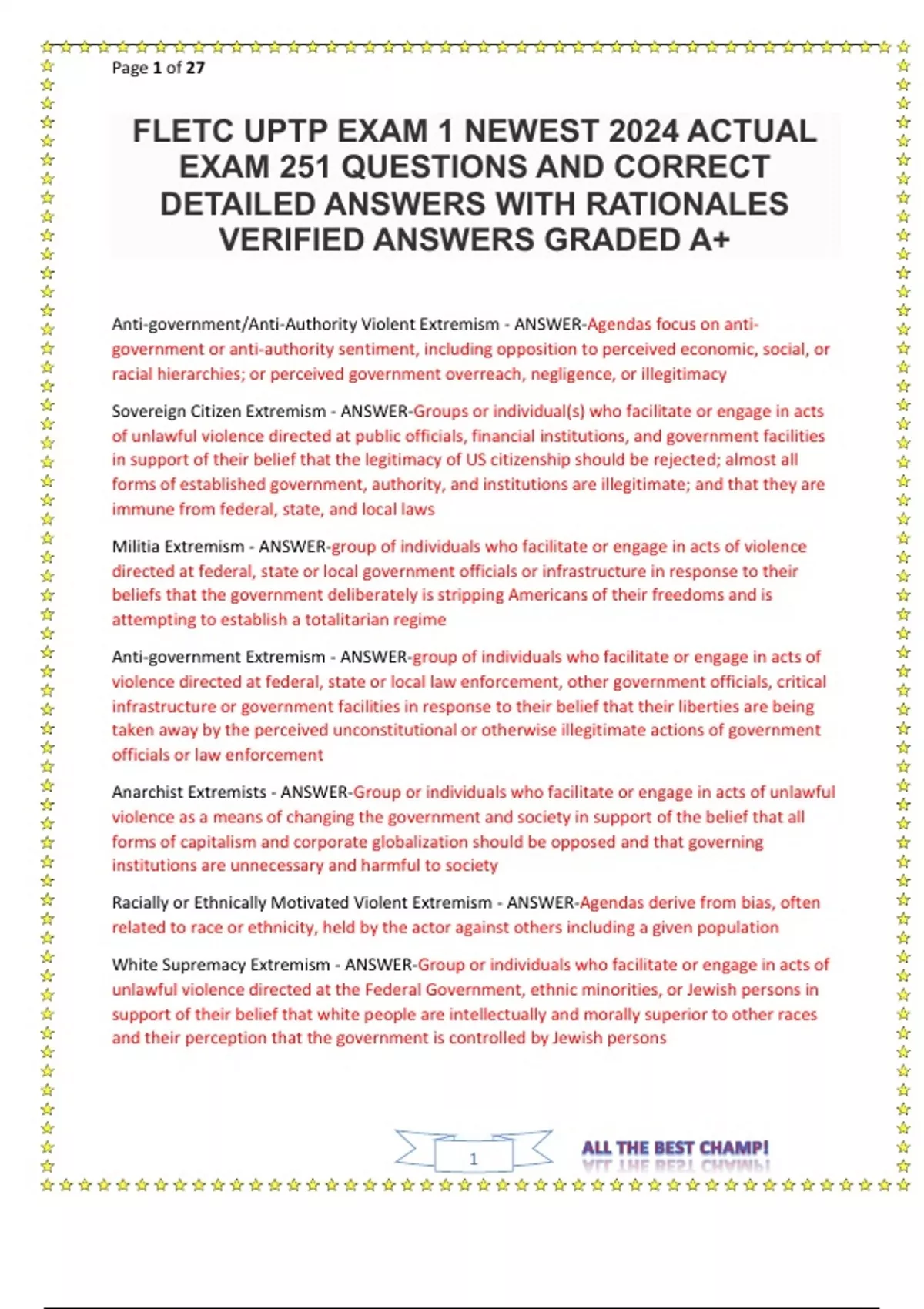 FLETC UPTP EXAM 1 NEWEST 2024 ACTUAL EXAM 251 QUESTIONS AND CORRECT DETAILED ANSWERS WITH RATIONALES VERIFIED ANSWERS GRADED A+