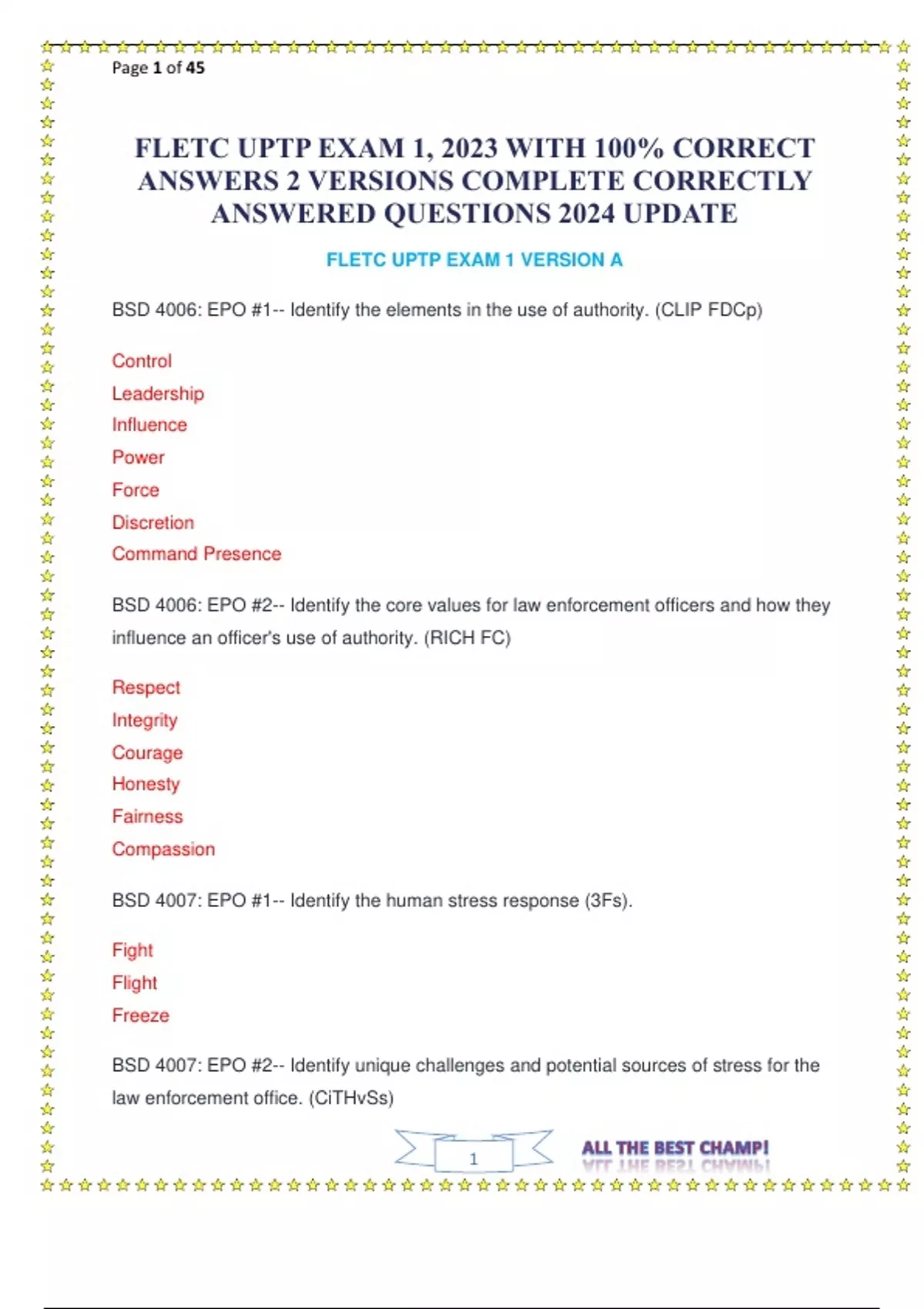 FLETC UPTP EXAM 1, 2023 WITH 100- CORRECT ANSWERS 2 VERSIONS COMPLETE CORRECTLY ANSWERED QUESTIONS 2024 UPDATE.