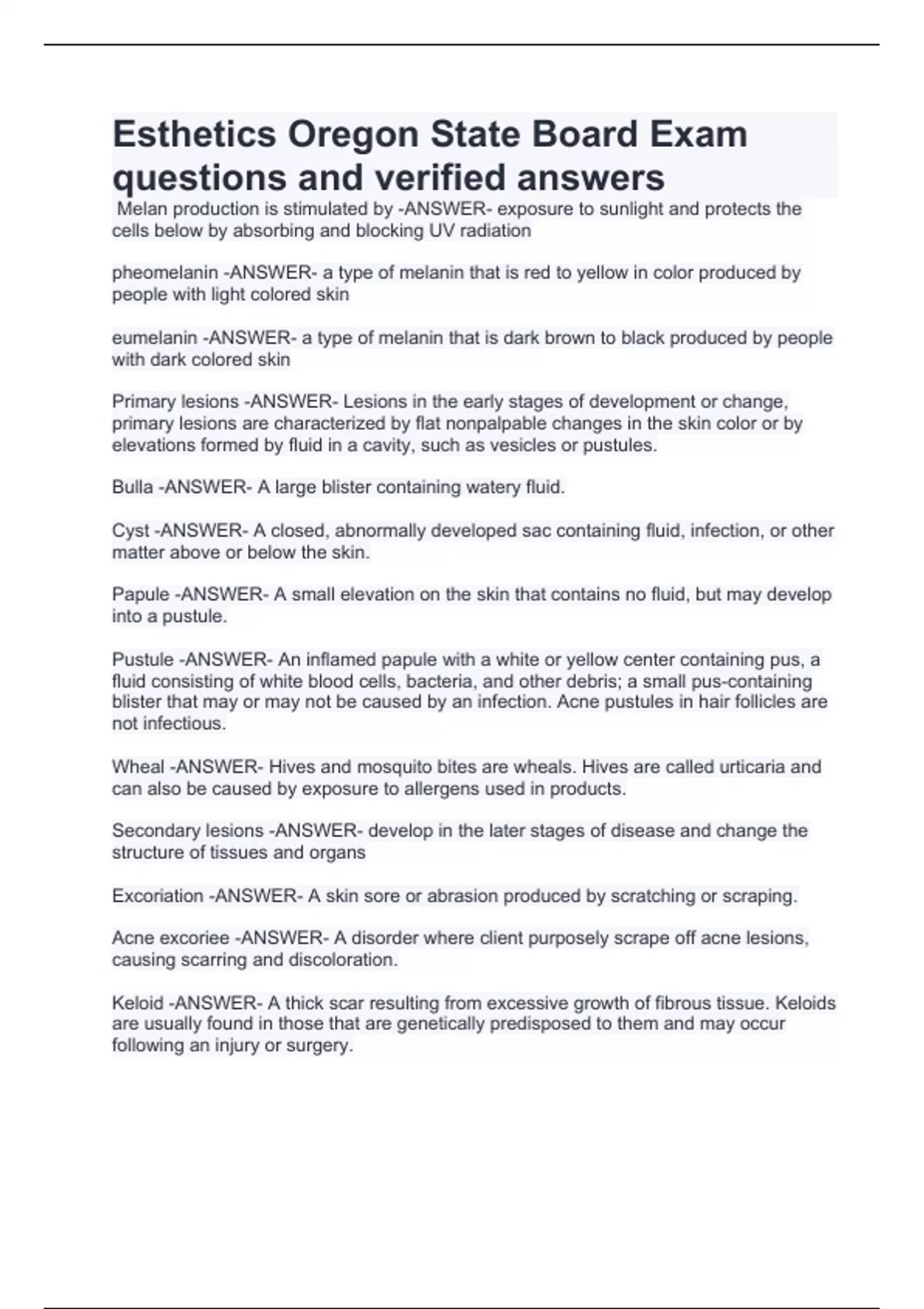 exposure to sunlight and protects the cells below by absorbing and blocking UV radiation pheomelanin -ANSWER- a type of melanin that is red to yellow in color produced by people with light colored skin eumelanin -ANSWER- a type of melanin that is dark brown to black produced by people with dark colored skin Primary lesions -ANSWER- Lesions in the early stages of development or change, primary lesions are characterized by flat nonpalpable changes in the skin color or by elevations formed by fluid in a cavity, such as vesicles or pustules. Bulla -ANSWER- A large blister containing watery fluid. Cyst -ANSWER- A closed, abnormally developed sac containing fluid, infection, or other matter above or below the skin. Papule -ANSWER- A small elevation on the skin that contains no fluid, but may develop into a pustule. Pustule -ANSWER- An inflamed papule with a white or yellow center containing pus, a fluid consisting of white blood cells, bacteria, and other debris; a small pus-containing blister that may or may not be caused by an infection. Acne pustules in hair follicles are not infectious. Wheal -ANSWER- Hives and mosquito bites are wheals. Hives are called urticaria and can also be caused by exposure to allergens used in products. Secondary lesions -ANSWER- develop in the later stages of disease and change the structure of tissues and organs Excoriation -ANSWER- A skin sore or abrasion produced by scratching or scraping. Acne excoriee -ANSWER- A disorder where client purposely scrape off acne lesions, causing scarring and discoloration. Keloid -ANSWER- A thick scar resulting from excessive growth of fibrous tissue. Keloids are usually found in those that are genetically predisposed to them and may occur following an injury or surgery. Scar -ANSWER- Discolored, slightly raised mark on the skin formed after an injury or lesion of the skin has healed. The tissue hardens to heal the injury. Thick, elevated scars are hypertrophic. Acne -ANSWER- A chronic inflammatory skin disorder of the sebaceous glands characterized by comedones and blemishes. Comedo -ANSWER- A noninflamed buildup of cells, sebum, and other debris inside follicles. Open comedo -ANSWER- A blackhead open at the surface and exposed to air. When the follicle is filled with an excess of oil a blackhead forms. It is dark because it is exposed to oxygen and oxidation occurs. Closer comedo -ANSWER- Forms when the openings of the follicles are blocked with debris and white cells. Also referred to as a whitehead but should not be confused with the more hardened white type of papules called milia. Furuncle -ANSWER- AKA boil, a subcutaneous abscess filled with pus. Milia -ANSWER- The epidermal cysts are small, firm, white papules. Milia are whitish, pearl like masses of sebum and dead cells under the skin with no visible openings often mistakenly called whiteheads. Seborrhea -ANSWER- Severe oiliness of the skin Bromhidrosis -ANSWER- Foul smelling perspiration usually in the armpits or on the feet. Dermatitis -ANSWER- An inflammatory condition of the skin; various forms include lesions such as eczema, vesicles or papules. The 3 main categories of dermatitis are atopic, contact, and seborrheic.