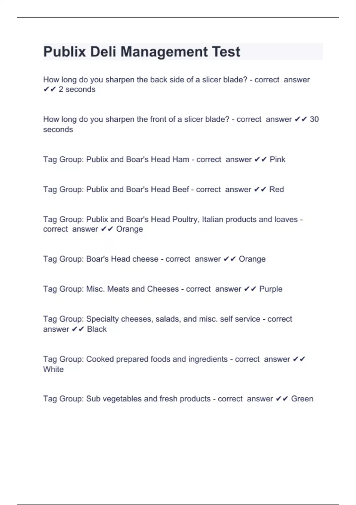 Publix Deli Management Test How long do you sharpen the back side of a slicer blade? - correct answer 2 seconds How long do you sharpen the front of a slicer blade? - correct answer 30 seconds Tag Group: Publix and Boar's Head Ham - correct answer Pink Tag Group: Publix and Boar's Head Beef - correct answer Red Tag Group: Publix and Boar's Head Poultry, Italian products and loaves - correct answer Orange Tag Group: Boar's Head cheese - correct answer Orange Tag Group: Misc. Meats and Cheeses - correct answer Purple Tag Group: Specialty cheeses, salads, and misc. self service - correct answer Black Tag Group: Cooked prepared foods and ingredients - correct answer White Tag Group: Sub vegetables and fresh products - correct answer Green