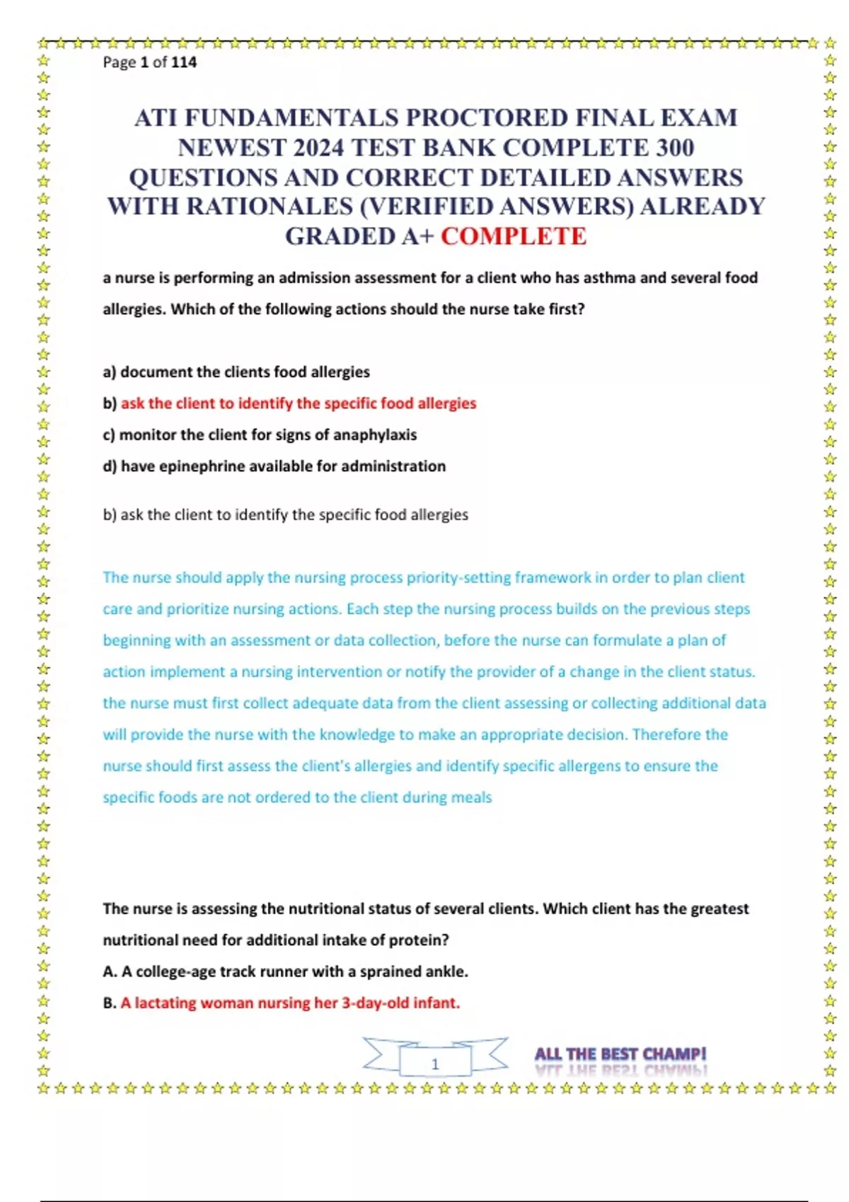 ATI FUNDAMENTALS PROCTORED FINAL EXAM NEWEST 2024 TEST BANK COMPLETE 300 QUESTIONS AND CORRECT DETAILED ANSWERS WITH RATIONALES (VERIFIED ANSWERS) ALREADY GRADED A+ COMPLETE