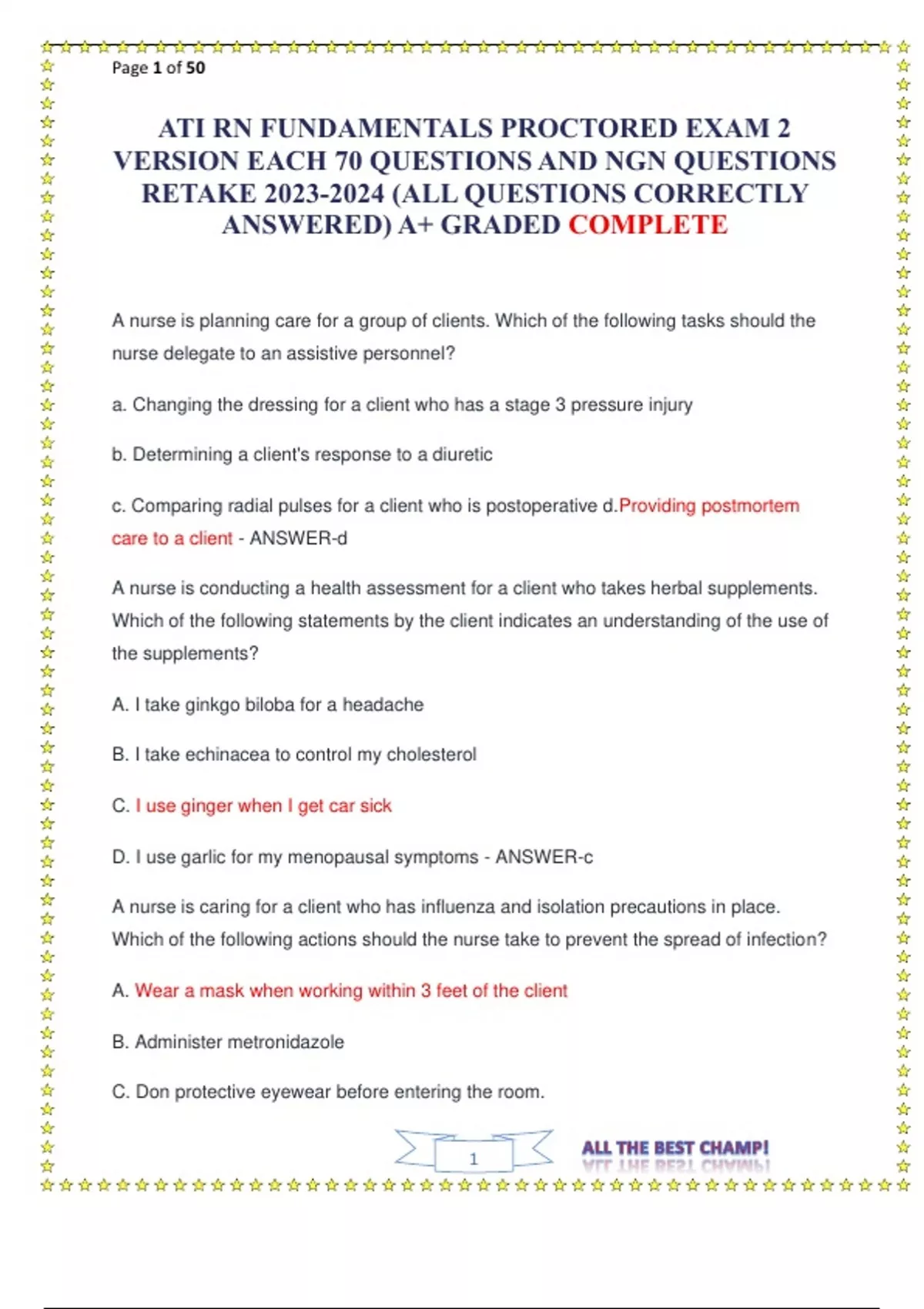 ATI RN FUNDAMENTALS PROCTORED EXAM 7 VERSION EACH 70 QUESTIONS AND NGN QUESTIONS RETAKE 2023/2024 (ALL QUESTIONS CORRECTLY ANSWERED) A+ GRADED