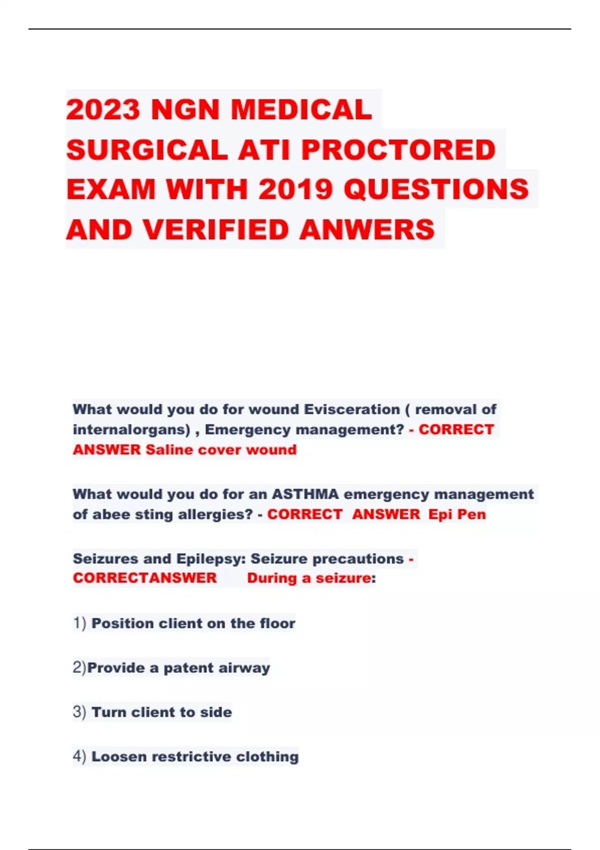 2023 NGN MEDICAL SURGICAL ATI PROCTORED EXAM WITH 2019 QUESTIONS AND VERIFIED ANWERS What would you do for wound Evisceration ( removal of internalorgans) , Emergency management? - CORRECT ANSWER Saline cover wound What would you do for an ASTHMA emergency management of abee sting allergies? - CORRECT ANSWER Epi Pen Seizures and Epilepsy: Seizure precautions - CORRECTANSWER During a seizure: 1) Position client on the floor 2)Provide a patent airway 3) Turn client to side 4) Loosen restrictive clothing Cancer treatment options: Protective Isolation - CORRECT ANSWER If WBC drops below 1,000, place the client in a privateroom and initiate neutropenic precautions. - Have client remain in his room unless he needs to leave for adiagnostic procedure, in that case transport patient and place amask on him.