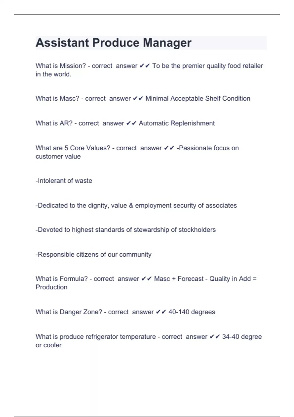 Assistant Produce ManagerWhat is Mission? - correct answer To be the premier quality food retailer in the world. What is Masc? - correct answer Minimal Acceptable Shelf Condition What is AR? - correct answer Automatic Replenishment What are 5 Core Values? - correct answer -Passionate focus on customer value -Intolerant of waste -Dedicated to the dignity, value & employment security of associates -Devoted to highest standards of stewardship of stockholders -Responsible citizens of our community What is Formula? - correct answer Masc + Forecast - Quality in Add = Production What is Danger Zone? - correct answer 40-140 degrees