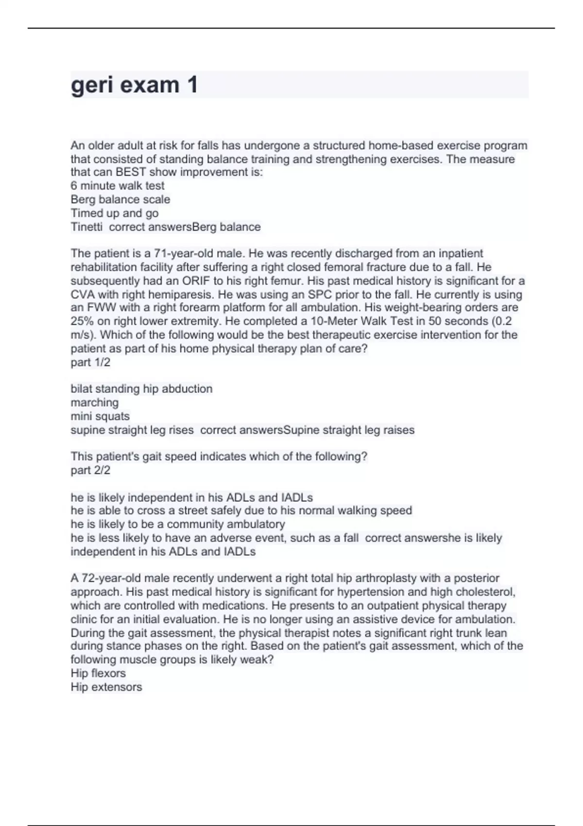 An older adult at risk for falls has undergone a structured home-based exercise program that consisted of standing balance training and strengthening exercises. The measure that can BEST show improvement is: 6 minute walk test Berg balance scale Timed up and go Tinetti correct answersBerg balance The patient is a 71-year-old male. He was recently discharged from an inpatient rehabilitation facility after suffering a right closed femoral fracture due to a fall. He subsequently had an ORIF to his right femur. His past medical history is significant for a CVA with right hemiparesis. He was using an SPC prior to the fall. He currently is using an FWW with a right forearm platform for all ambulation. His weight-bearing orders are 25% on right lower extremity. He completed a 10-Meter Walk Test in 50 seconds (0.2 m/s). Which of the following would be the best therapeutic exercise intervention for the patient as part of his home physical therapy plan of care? part 1/2 bilat standing hip abduction marching mini squats supine straight leg rises correct answersSupine straight leg raises This patient's gait speed indicates which of the following? part 2/2 he is likely independent in his ADLs and IADLs he is able to cross a street safely due to his normal walking speed he is likely to be a community ambulatory he is less likely to have an adverse event, such as a fall correct answershe is likely independent in his ADLs and IADLs A 72-year-old male recently underwent a right total hip arthroplasty with a posterior approach. His past medical history is significant for hypertension and high cholesterol, which are controlled with medications. He presents to an outpatient physical therapy clinic for an initial evaluation. He is no longer using an assistive device for ambulation. During the gait assessment, the physical therapist notes a significant right trunk lean during stance phases on the right. Based on the patient's gait assessment, which of the following muscle groups is likely weak? Hip flexors Hip extensors