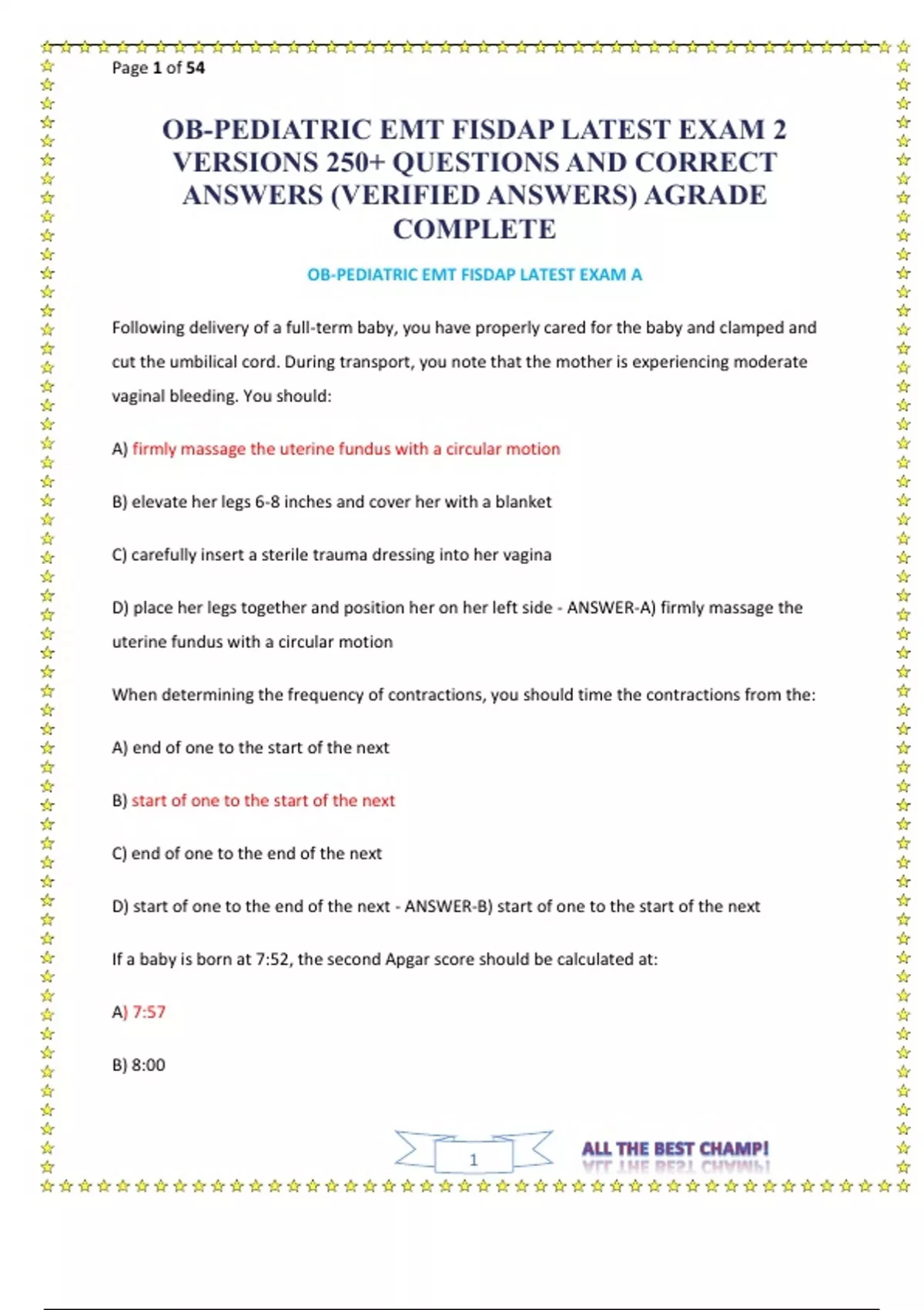 OB/PEDIATRIC EMT FISDAP LATEST EXAM 7 VERSIONS 1000+ QUESTIONS AND CORRECT ANSWERS (VERIFIED ANSWERS) AGRADE COMPLETE