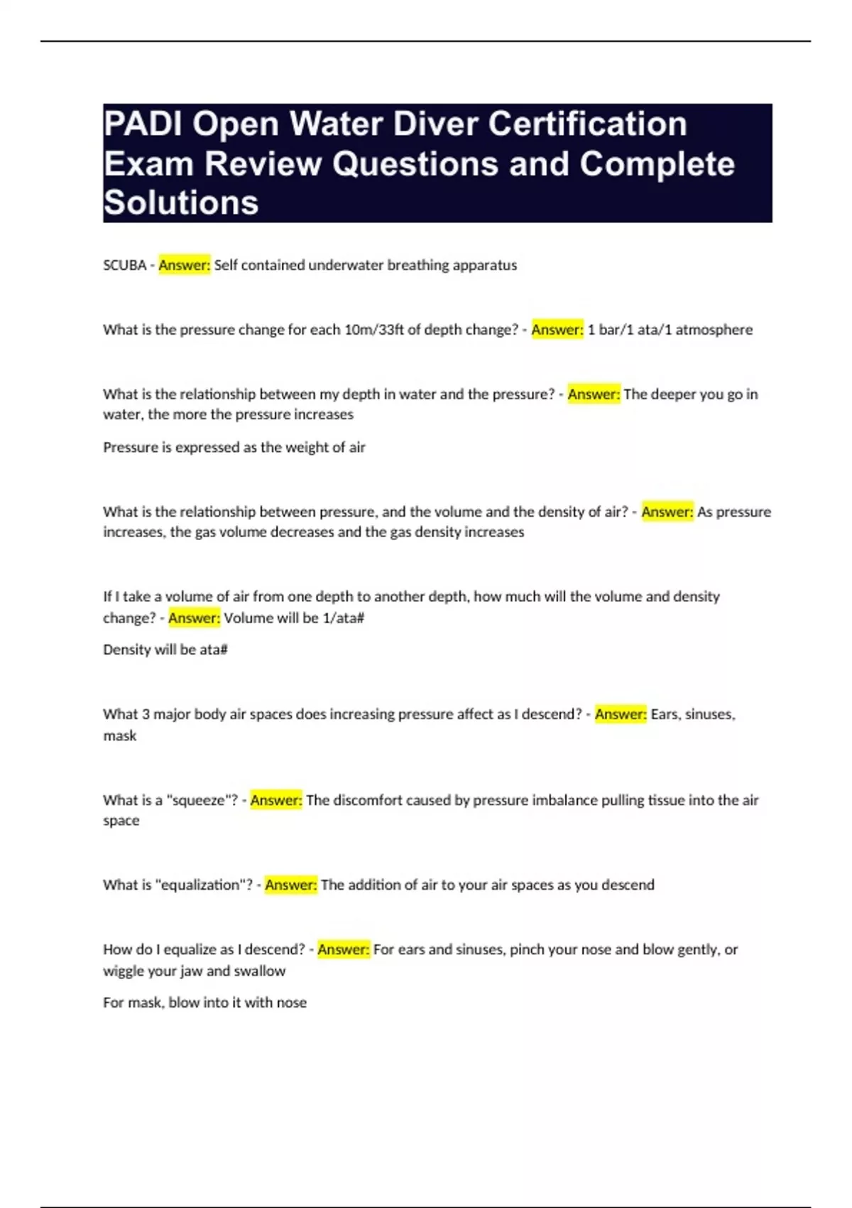 PADI Open Water Diver Certification Exam Review Questions and Complete Solutions