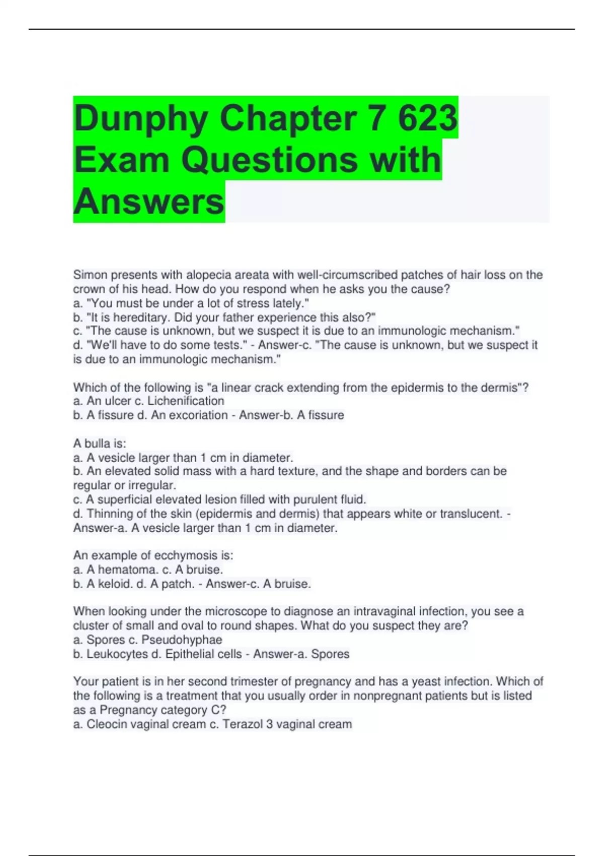 Dunphy Chapter 7 623 Exam Questions with Answers Simon presents with alopecia areata with well-circumscribed patches of hair loss on the crown of his head. How do you respond when he asks you the cause? a. "You must be under a lot of stress lately." b. "It is hereditary. Did your father experience this also?" c. "The cause is unknown, but we suspect it is due to an immunologic mechanism." d. "We'll have to do some tests." - Answer-c. "The cause is unknown, but we suspect it is due to an immunologic mechanism." Which of the following is "a linear crack extending from the epidermis to the dermis"? a. An ulcer c. Lichenification b. A fissure d. An excoriation - Answer-b. A fissure A bulla is: a. A vesicle larger than 1 cm in diameter. b. An elevated solid mass with a hard texture, and the shape and borders can be regular or irregular. c. A superficial elevated lesion filled with purulent fluid. d. Thinning of the skin (epidermis and dermis) that appears white or translucent. - Answer-a. A vesicle larger than 1 cm in diameter. An example of ecchymosis is: a. A hematoma. c. A bruise. b. A keloid. d. A patch. - Answer-c. A bruise. When looking under the microscope to diagnose an intravaginal infection, you see a cluster of small and oval to round shapes. What do you suspect they are? a. Spores c. Pseudohyphae b. Leukocytes d. Epithelial cells - Answer-a. Spores Your patient is in her second trimester of pregnancy and has a yeast infection. Which of the following is a treatment that you usually order in nonpregnant patients but is listed as a Pregnancy category C? a. Cleocin vaginal cream c. Terazol 3 vaginal cream b. Monistat combination pack d. Diflucan 150 mg - Answer-d. Diflucan 150 mg Tinea unguium is also known as: a. Onychomycosis. c. Tinea manuum. b. Tinea versicolor. d. Tinea corporis. - Answer-a. Onychomycosis