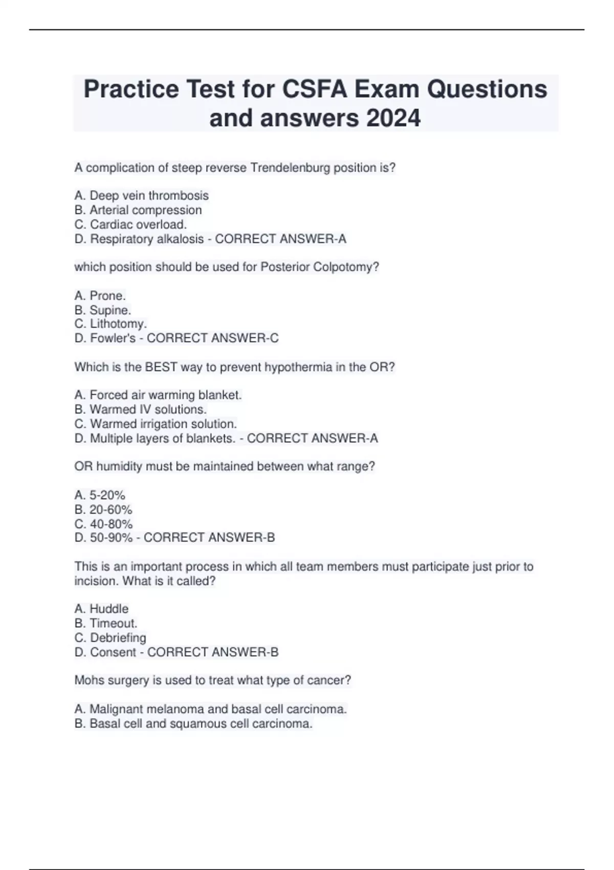 Practice Test for CSFA Exam Questions and answers 2024 A complication of steep reverse Trendelenburg position is? A. Deep vein thrombosis B. Arterial compression C. Cardiac overload. D. Respiratory alkalosis - CORRECT ANSWER-A which position should be used for Posterior Colpotomy? A. Prone. B. Supine. C. Lithotomy. D. Fowler's - CORRECT ANSWER-C Which is the BEST way to prevent hypothermia in the OR? A. Forced air warming blanket. B. Warmed IV solutions. C. Warmed irrigation solution. D. Multiple layers of blankets. - CORRECT ANSWER-A OR humidity must be maintained between what range? A. 5-20% B. 20-60% C. 40-80% D. 50-90% - CORRECT ANSWER-B This is an important process in which all team members must participate just prior to incision. What is it called? A. Huddle B. Timeout. C. Debriefing D. Consent - CORRECT ANSWER-B Mohs surgery is used to treat what type of cancer? A. Malignant melanoma and basal cell carcinoma. B. Basal cell and squamous cell carcinoma. C. Malignant melanoma and squamous cell carcinoma. D. Basal cell and Merkel cell carcinoma - CORRECT ANSWER-B When reviewing the patients chart scheduled for a mammoplasty, it's noticed that their K+ is 5.4. What is the patient suffering from? A. Hyperkalemia B. Hypercalcemia C. Hypokalemia. D. Hypocalcemia - CORRECT ANSWER-A Which device is the preferred positioning device used during surgical procedures? A. Foam pads. B. Saline bags. C. Gel pads. D. Sheet rolls. - CORRECT ANSWER-C When inserting a Foley catheter into a male patient, the surgical assistant encounters difficulty. What is the NEXT step that the surgical as