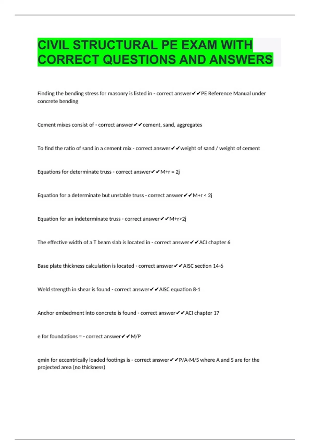 CIVIL STRUCTURAL PE EXAM WITH CORRECT QUESTIONS AND ANSWERS
