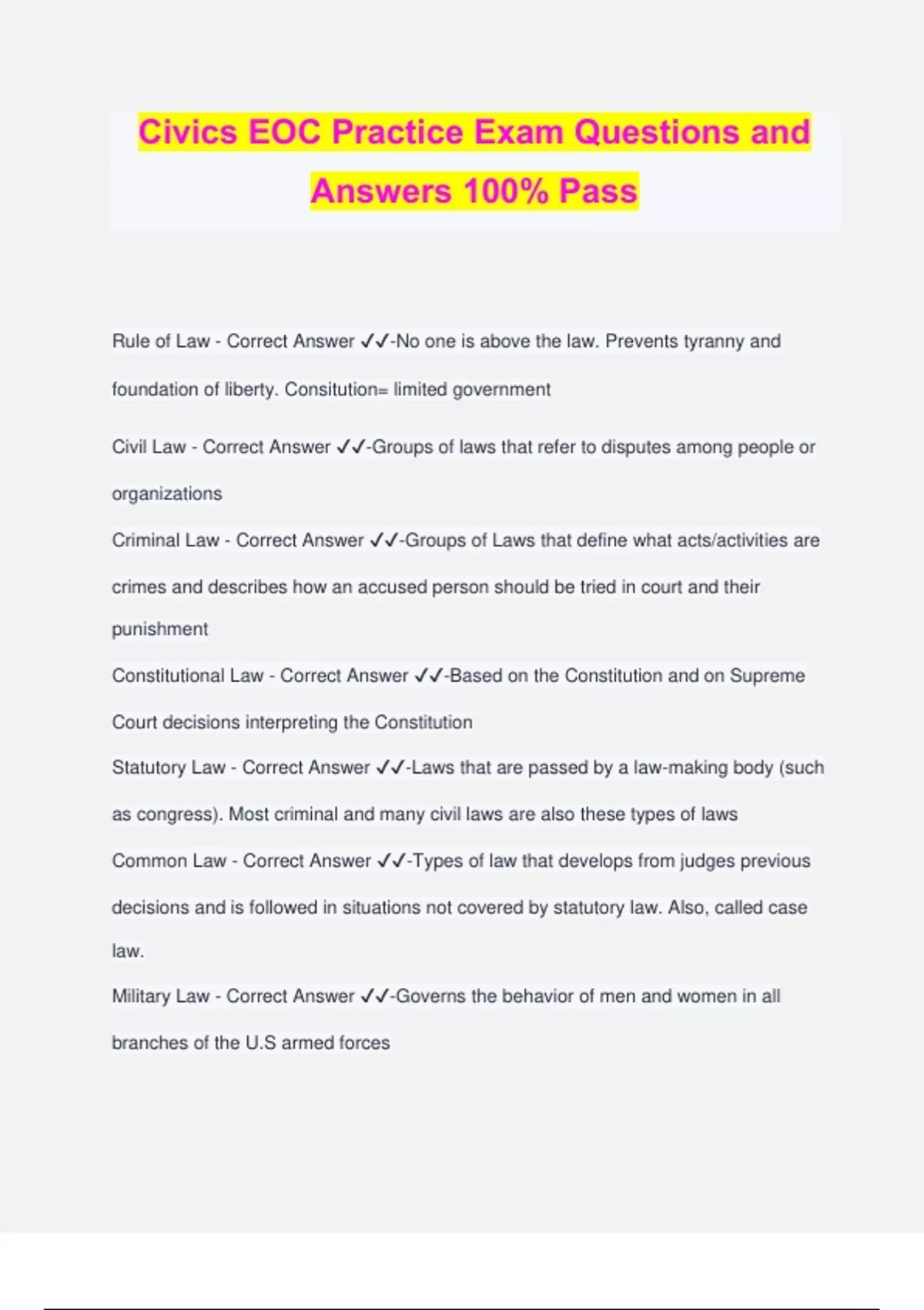 Civics EOC Practice Exam Questions and Answers 100% Pass Rule of Law - Correct Answer ️️ -No one is above the law. Prevents tyranny and foundation of liberty. Consitution= limited government Civil Law - Correct Answer ️️ -Groups of laws that refer to disputes among people or organizations Criminal Law - Correct Answer ️️ -Groups of Laws that define what acts/activities are crimes and describes how an accused person should be tried in court and their punishment Constitutional Law - Correct Answer ️️ -Based on the Constitution and on Supreme Court decisions interpreting the Constitution Statutory Law - Correct Answer ️️ -Laws that are passed by a law-making body (such as congress). Most criminal and many civil laws are also these types of laws Common Law - Correct Answer ️️ -Types of law that develops from judges previous decisions and is followed in situations not covered by statutory law. Also, called case law. Military Law - Correct Answer ️️ -Governs the behavior of men and women in all branches of the U.S armed forces Juvenile Law - Correct Answer ️️ -An area of the law that deals with the actions and well-being of persons who are not yet adults Citizenship - Correct Answer ️️ -All who are born or naturalized in the United States are citizens of the US and of the state they reside in Naturalization - Correct Answer ️️ -Legal process through which immigrants become U.S citizens 1. Must be at least 18 years old and have a background check showing g"ood moral character" 2. Be fingerprinted 3. Pass test on Civics, U.S history and English 4. Take Oath of Allegiance Law of Blood - Correct Answer ️️ -Idea that a person's nationality at birth is the same as that of his or her natural parents Law of Soil - Correct Answer ️️ -Idea that the country of citizenship of a child is determined by its country of birth Civic Responsibility - Correct Answer ️️ -Something you should do as a citizen Three characterisitics of a citizen are... 1. stay informed 2. vote 3. volunteer Civic Duty - Correct Answer ️️ -Something that each citizen owes their nation 1. obey laws 2. pay taxes 3. serve on a jury 4. defend the nation Selective Service - Correct Answer ️️ -A system for calling up people for compulsory (required) military service 1st Amendment - Correct Answer ️️ -Protect 5 freedoms: religon, speech, press, assembly and petition 2nd Amendment - Correct Answer ️️ -Protects the right to bear arms Third Amendment - Correct Answer ️️ -No soldiers will be housed without the consent of the owners during times of peace. Protects home-owners during times of war Fourth Amendment - Correct Answer ️️ -Protects against unreasonable search and seizures without a warrant or probable cause Fifth Amendment - Correct Answer ️️ -Protects against self-incrimination Cant be deprived of rights without due process of law Protects from being tried for the same case criminal case offense twice Before being for a serious crime grand jury must indict (formally accuse) the person of the crime Sixth Amendment - Correct Answer ️️ -Right to prompt and public trial decided by a jury A person must be informed of the charges against them Right to legal attorney Can hear and question all witnesses and have their own witnesses Seventh Amendment - Correct Answer ️️ -In cases involving money or property over $20 the right to a trial by jury is preserved Eighth Amendment - Correct Answer ️️ -Protects against excessive bail and fines Protects against cruel and unusual punishments Ninth Amendment - Correct Answer ️️ -There are rights reserved to the people that are not listed in the Constitution Refers to the natural rights of people Also called unenumerated rights - those not spelled out in the constitution Tenth Amendment - Correct Answer ️️ -Limits the power of the federal government Powers that are not reserved for the federal government nor prohibited to the states belong to the stated or the people Suffrage - Correct Answer ️️ -The right of voting Double Jeopardy - Correct Answer ️️ -The act of putting a person through a second trial for offense for which he or she has already been prosecuted or convicted. Against the 5th amendment Eminent Domain - Correct Answer ️️ -Government power to take private property for public use without the owners consent. The 5th amendment requires the payment of just compensation to the owner Due Process - Correct Answer ️️ -The government has to follow rules and established procedures in everything it does and this protection helps to ensure justice. Contained in the 5th amendment Pleading the Fift - Correct Answer ️️ -A persons refusal to answer a question on the ground that the answer might incriminate the person Appellate Process - Correct Answer ️️ -The process to have a higher court review the results of a trial court or lower court. The Supreme. court is mainly a Appeals court Ex Post Facto - Correct Answer ️️ -Laws adopted after an act is committed making it illegal although it was legal when done, or increases the penalty