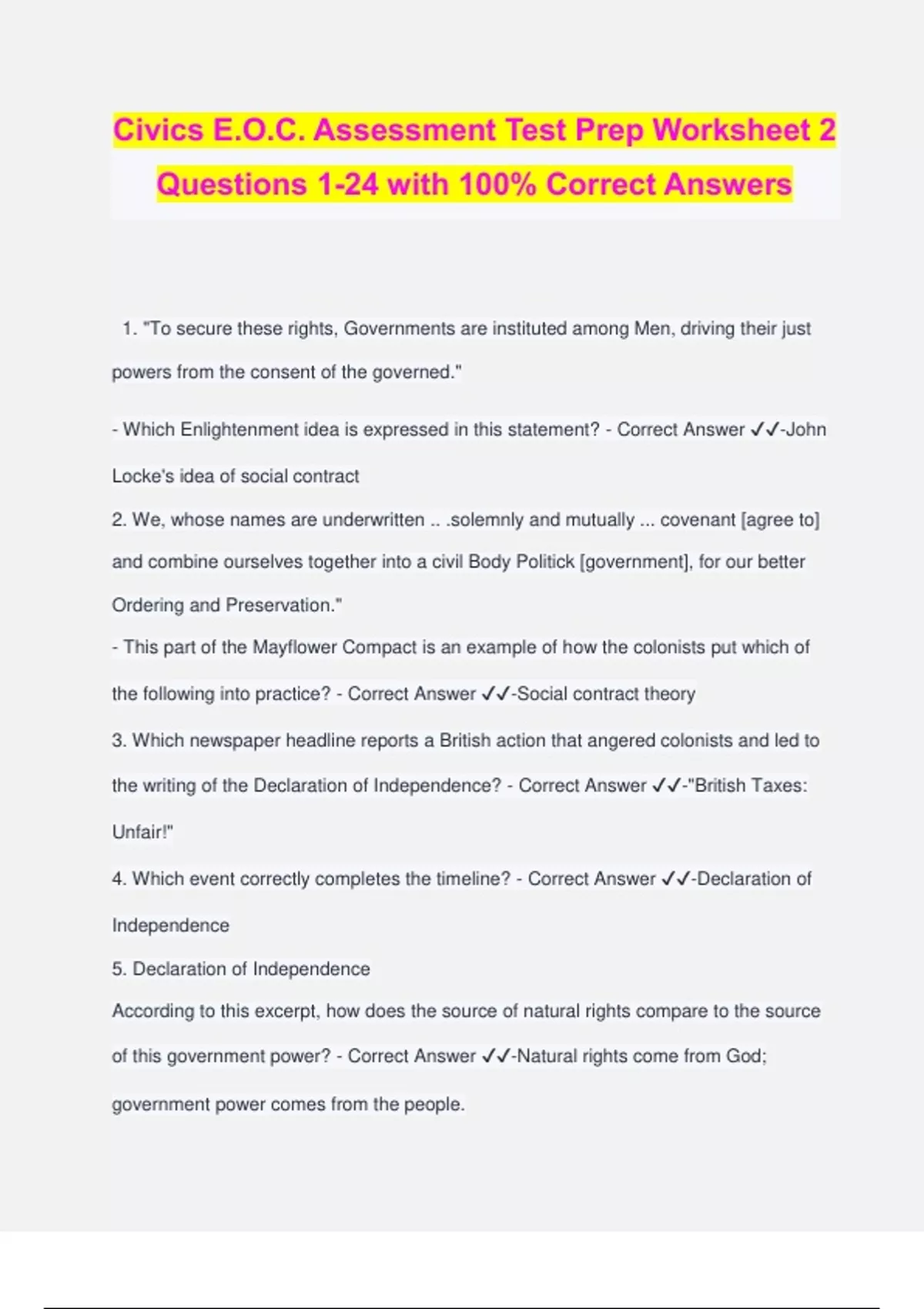 Civics E.O.C. Assessment Test Prep Worksheet 2 Questions 1-24 with 100% Correct Answers 1. "To secure these rights, Governments are instituted among Men, driving their just powers from the consent of the governed." - Which Enlightenment idea is expressed in this statement? - Correct Answer ️️ -John Locke's idea of social contract 2. We, whose names are underwritten .. .solemnly and mutually ... covenant [agree to] and combine ourselves together into a civil Body Politick [government], for our better Ordering and Preservation." - This part of the Mayflower Compact is an example of how the colonists put which of the following into practice? - Correct Answer ️️ -Social contract theory 3. Which newspaper headline reports a British action that angered colonists and led to the writing of the Declaration of Independence? - Correct Answer ️️ -"British Taxes: Unfair!" 4. Which event correctly completes the timeline? - Correct Answer ️️ -Declaration of Independence 5. Declaration of Independence According to this excerpt, how does the source of natural rights compare to the source of this government power? - Correct Answer ️️ -Natural rights come from God; government power comes from the people. 6. How did these weaknesses impact the writing of the Constitution? - Correct Answer ️️ -The founding fathers created a government with three branches. 7. According to the Preamble of the Constitution, which of the following are basic purposes of government? - Correct Answer ️️ -Establish justice, ensure tranquility, provide for common defense, and promote welfare. 8. Which of the following most clearly reveals the Founders ideas