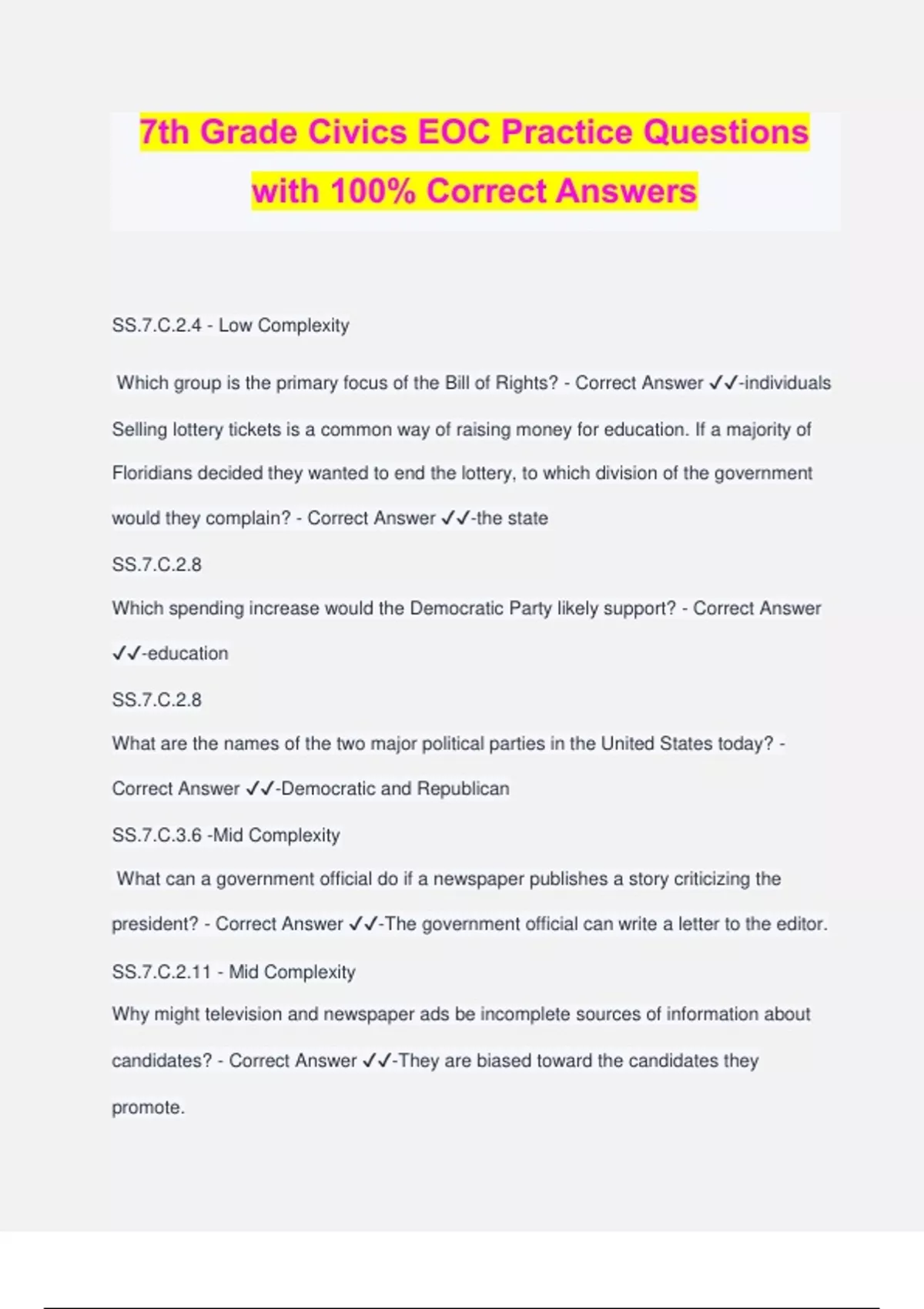 7th Grade Civics EOC Practice Questions with 100% Correct Answers SS.7.C.2.4 - Low Complexity Which group is the primary focus of the Bill of Rights? - Correct Answer ️️ -individuals Selling lottery tickets is a common way of raising money for education. If a majority of Floridians decided they wanted to end the lottery, to which division of the government would they complain? - Correct Answer ️️ -the state SS.7.C.2.8 Which spending increase would the Democratic Party likely support? - Correct Answer ️️ -education SS.7.C.2.8 What are the names of the two major political parties in the United States today? - Correct Answer ️️ -Democratic and Republican SS.7.C.3.6 -Mid Complexity What can a government official do if a newspaper publishes a story criticizing the president? - Correct Answer ️️ -The government official can write a letter to the editor. SS.7.C.2.11 - Mid Complexity Why might television and newspaper ads be incomplete sources of information about candidates? - Correct Answer ️️ -They are biased toward the candidates they promote. SS.7.C.1.1 - Low Complexity Which idea in the Declaration of Independence did John Locke inspire? - Correct Answer ️️ -right to life, liberty, and the pursuit of happiness SS.7.C.2.1 - Low Complexity What is a characteristic of U.S. citizenship according to the Fourteenth Amendment to the U.S. Constitution? - Correct Answer ️️ -born or naturalized in the United States SS.7.C.2.9 - Low Complexity Which is NOT required to become President of the United States? - Correct Answer ️️ -Is Required: at least fourteen-year resident, at least age thirty five, & natural bor