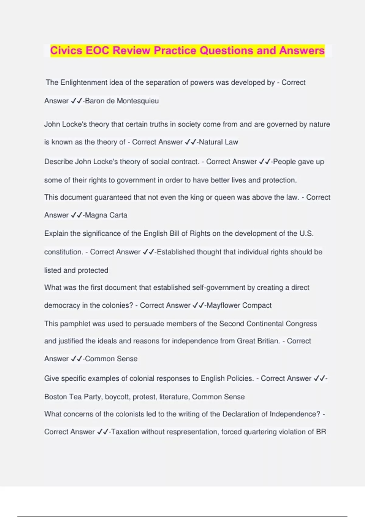 Civics EOC Review Practice Questions and Answers The Enlightenment idea of the separation of powers was developed by - Correct Answer ️️ -Baron de Montesquieu John Locke's theory that certain truths in society come from and are governed by nature is known as the theory of - Correct Answer ️️ -Natural Law Describe John Locke's theory of social contract. - Correct Answer ️️ -People gave up some of their rights to government in order to have better lives and protection. This document guaranteed that not even the king or queen was above the law. - Correct Answer ️️ -Magna Carta Explain the significance of the English Bill of Rights on the development of the U.S. constitution. - Correct Answer ️️ -Established thought that individual rights should be listed and protected What was the first document that established self-government by creating a direct democracy in the colonies? - Correct Answer ️️ -Mayflower Compact This pamphlet was used to persuade members of the Second Continental Congress and justified the ideals and reasons for independence from Great Britian. - Correct Answer ️️ -Common Sense Give specific examples of colonial responses to English Policies. - Correct Answer ️️ - Boston Tea Party, boycott, protest, literature, Common Sense What concerns of the colonists led to the writing of the Declaration of Independence? - Correct Answer ️️ -Taxation without respresentation, forced quartering violation of BR What were the main complaints/arguments against Britian in the Declaration of Independence? - Correct Answer ️️ -Colonists felt that England was not protecting their rights, taxing without representation, abusing power John Locke's theory of ___________ guaranteed that all individuals are entitled to basic rights such as life, liberty, and property. - Correct Answer ️️ -Natural Rights Which document outlined the first form of government for the United States? Which system of government did this document create? - Correct Answer ️️ -Articles of Confederation, a confederal system (no central government) List some of the major weaknesses of the Articles of Confederation. - Correct Answer ️️ -Central government had no power to tax, no national court system, no executive branch, no power to enforce laws, no power to regulate trade, all 13 states were needed to approve an amendment, approval of 9 of 13 states to enact laws What is the purpose of the Preamble to the constitution? - Correct Answer ️️ -It introduces the goals and concepts outlined in the constitution + reinforces principles of good government What was the main argument the Federalists used to support the ratification of the Constitution? - Correct Answer ️️ -The need for a stronger government List the arguments the Anti-Federalists used against ratifying the Constitution. - Correct Answer ️️ -No bill of rights, central government too strong A legal member of a country is a - Correct Answer ️️ -Citizen Name two ways a person can become a U.S. citizen - Correct Answer ️️ -Birth to citizen parent called Law of Blood; Birth in US or US territory called Law of Soil; or naturalization List the steps in the naturalization process. - Correct Answer ️️ -apply for residency visa, wait 5 years, apply for citizenship status, finger printed, interview with Immigration Services , pass citizenship test, take oath What are the major differences between Democrats and Republicans? - Correct Answer ️️ -Democrats believe in a large government, encouraging government involvement with many programs . Republicans believe in a small government with few programs, encouraging communities and charities to take care of their own neighbors and families. What is a plank? - Correct Answer ️️ -A specific issue that is a part of a parties' platform. A dock is a platform, the planks are the individual boards. The platform is the big theme, the plank is the individual idea. i.e. helping the poor people is a