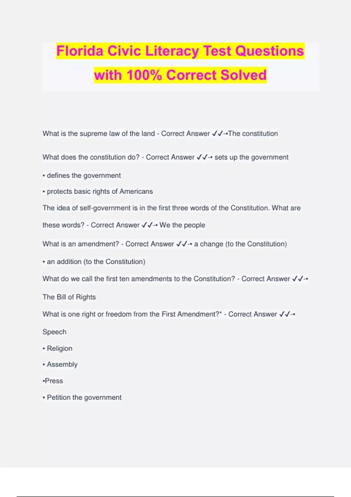 Florida Civic Literacy Test Questions with 100% Correct Solved What is the supreme law of the land - Correct Answer ️️ -▪The constitution What does the constitution do? - Correct Answer ️️ -▪ sets up the government ▪ defines the government ▪ protects basic rights of Americans The idea of self-government is in the first three words of the Constitution. What are these words? - Correct Answer ️️ -▪ We the people What is an amendment? - Correct Answer ️️ -▪ a change (to the Constitution) ▪ an addition (to the Constitution) What do we call the first ten amendments to the Constitution? - Correct Answer ️️ -▪ The Bill of Rights What is one right or freedom from the First Amendment?* - Correct Answer ️️ -▪ Speech ▪ Religion ▪ Assembly ▪Press ▪ Petition the government How many amendments does the Constitution have? - Correct Answer ️️ -▪ twenty- seven (27) What did the Declaration of Independence do? - Correct Answer ️️ -▪ announced our independence (from Great Britain) ▪ declared our independence (from Great Britain) ▪ said that the United States is free (from Great Britain) What are two rights in the Declaration of Independence? - Correct Answer ️️ -▪ life ▪ liberty ▪ pursuit of happiness What is freedom of religion? - Correct Answer ️️ -▪ You can practice any religion, or not practice a religion. What is the economic system in the United States?* - Correct Answer ️️ -▪ capitalist economy ▪ market economy What is the "rule of law"? - Correct Answer ️️ -▪ Everyone must follow the law ▪ Leaders must obey the law ▪ Government must obey the law ▪ No one is above the law Name one branch or part of the government.* - Correct Answer ️️ -▪ Congress ▪ legislative ▪ President ▪ executive ▪ the courts ▪ judicial What stops one branch of government from becoming too powerful? - Correct Answer ️️ -▪ checks and balances ▪ separation of powers Who is in charge of the executive branch? - Correct Answer ️️ -▪ the President Who makes federal laws? - Correct Answer ️️ -▪ Congress ▪ Senate and House (of Representatives) ▪ (U.S. or national) legislature What are the two parts of the U.S. Congress?* - Correct Answer ️️ -▪ the Senate and House (of Representatives) How many U.S. Senators are there? - Correct Answer ️️ -▪ 100 We elect a U.S. Senator for how many years? - Correct Answer ️️ -▪ six (6) Who is one of your state's U.S. Senators now?* - Correct Answer ️️ -▪ Marco Rubio The House of Representatives has how many voting members? - Correct Answer ️️ - ▪435 We elect a U.S. Representative for how many years? - Correct Answer ️️ -▪ two (2) Name yourU.S. Representative. - Correct Answer ️️ -▪Donna Shalala Who does a U.S. Senator represent? - Correct Answer ️️ -▪ all people of the state Why do some states have more Representatives than other states? - Correct Answer ️️ -▪(because of) the states population ▪(because) they have more people ▪(because) some states have more people We elect a President for how many years? - Correct Answer ️️ -▪ four (4