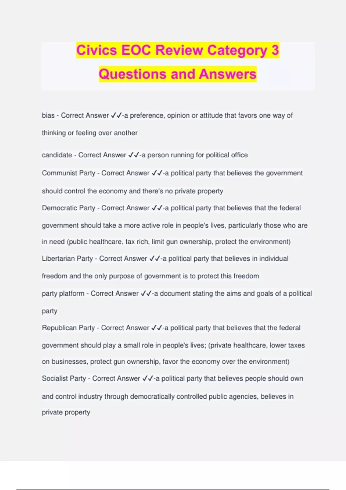 Civics EOC Review Category 3 Questions and Answers bias - Correct Answer ️️ -a preference, opinion or attitude that favors one way of thinking or feeling over another candidate - Correct Answer ️️ -a person running for political office Communist Party - Correct Answer ️️ -a political party that believes the government should control the economy and there's no private property Democratic Party - Correct Answer ️️ -a political party that believes that the federal government should take a more active role in people's lives, particularly those who are in need (public healthcare, tax rich, limit gun ownership, protect the environment) Libertarian Party - Correct Answer ️️ -a political party that believes in individual freedom and the only purpose of government is to protect this freedom party platform - Correct Answer ️️ -a document stating the aims and goals of a political party Republican Party - Correct Answer ️️ -a political party that believes that the federal government should play a small role in people's lives; (private healthcare, lower taxes on businesses, protect gun ownership, favor the economy over the environment) Socialist Party - Correct Answer ️️ -a political party that believes people should own and control industry through democratically controlled public agencies, believes in private property third party - Correct Answer ️️ -a political party that is not one of the two major parties in the country; a minor party two-party system - Correct Answer ️️ -a political system consisting primarily of two major parties, more or less equal in strength elector - Correct Answer ️️ -a person who has the right to vote in an election evaluate - Correct Answer ️️ -to determine or to judge issue based platform - Correct Answer ️️ -a document stating the goals and principles of a political party or political candidate, also known as a political platform natural born citizen - Correct Answer ️️ -someone who was born in the U.S. or born to U.S. citizens qualification - Correct Answer ️️ -the traits and accomplishments that fit a person for some function or office U.S. House of Representatives Qualifications - Correct Answer ️️ -Constitution requires that a person be at least 25 years-old, a resident of the state he/she wants to represent, and a citizen for at least 7 years. US Senate Qualifications - Correct Answer ️️ -Constitution requires that a person be at least 30 years-old, a resident of the state he/she wants to represent, and a citizen for at least 9 years interest group - Correct Answer ️️ -people who are concerned with some particular issue or part of the government and who try to influence legislators or to act in their favor, also known as a special interest group lobbying - Correct Answer ️️ -to conduct activities in order to influence public officials lobbyist - Correct Answer ️️ -a person who conducts activities in order to influence public officials media - Correct Answer ️️ -refers to various means of communication. ex: television, radio, newspapers and the Internet (web) petitioning the government - Correct Answer ️️ -any nonviolent, legal means of encouraging or disapproving government action, directed to the judicial, executive or legislative branch political action committee (PAC) - Correct Answer ️️ -a political organization that seeks to promote the cause of a particular interest group, usually through raising money and campaigning to elect candidates who support the group's views public policy - Correct Answer ️️ -government actions in the form of laws public sphere - Correct Answer ️️ -a place where society discuses the issues that affect everyone watchdog - Correct Answer ️️ -Media acts in this role to monitor the government and ensure that they are following the law/telling the truth, also a way to influence the government propaganda - Correct Answer ️️ -the method of spreading ideas or information to convince people to believe in a certain issue or act a certain way Symbolism - Correct Answer ️️ -the use of something to represent ideas